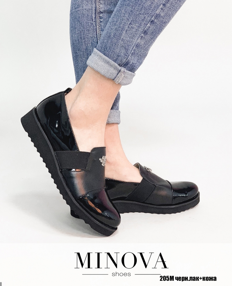 Туфли из комбинации лаковой кожи и замши на утолщенной рифленой подошве. Язычок украшен декоративной металлической деталью в виде пчелки. Для удобства при надевании, туфли оснащены эластичными резинками по бокам.