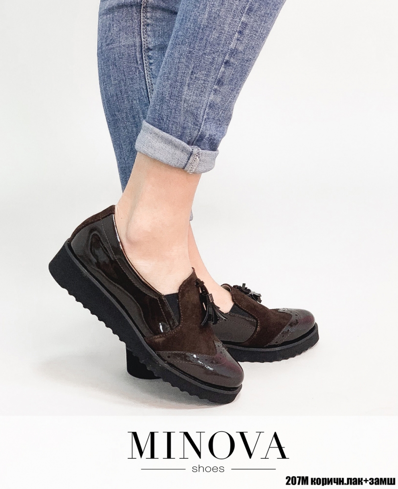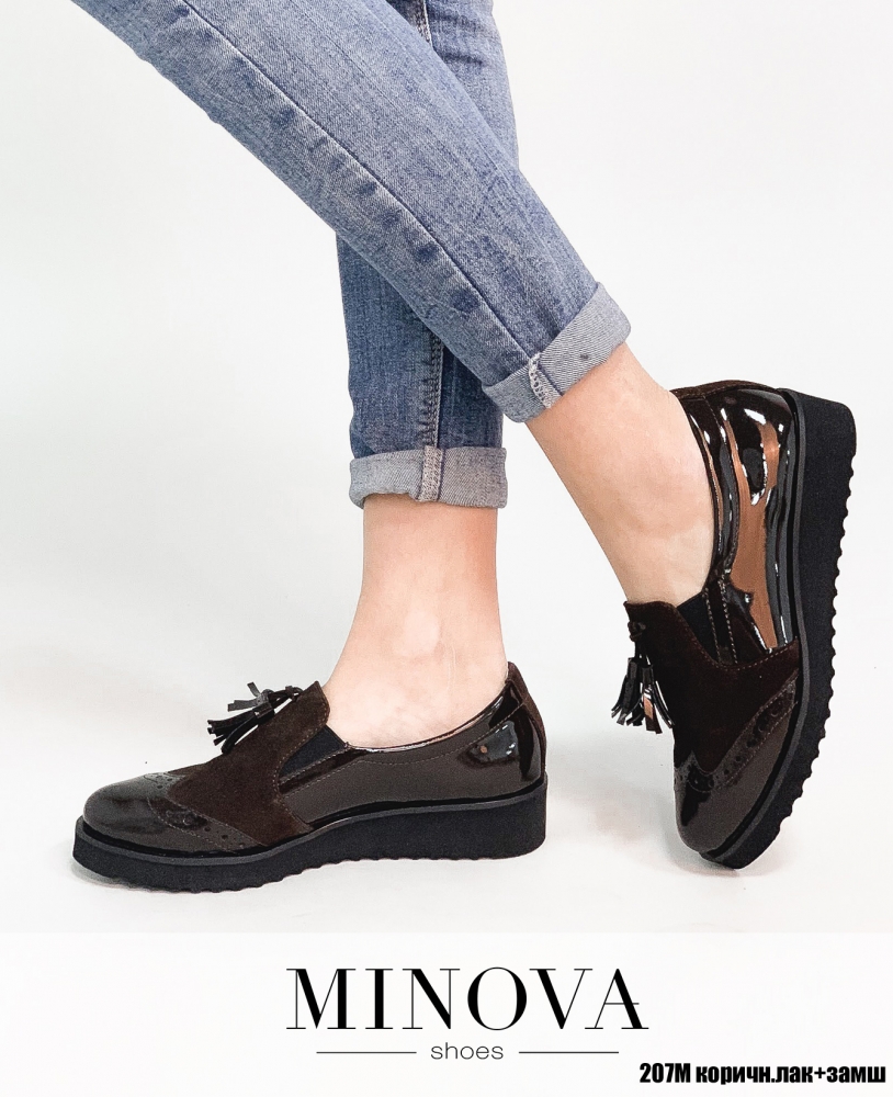 Лоферы из комбинации лаковой кожи и замши на рифленой черной подошве. Язычок украшен кисточками и дополнен резинками по бокам. Круглый носок оформлен броггированием.