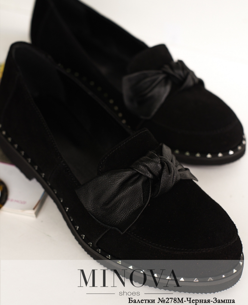 Аккуратные туфли из натуральной кожи для повседневного гардероба, украшенные бантом на подъёме и окантовкой из металлических заклёпок. Каблук невысокий, подошва плоская, с неглубоким рифлением. Без застёжек.