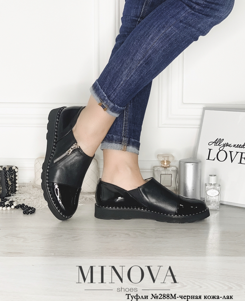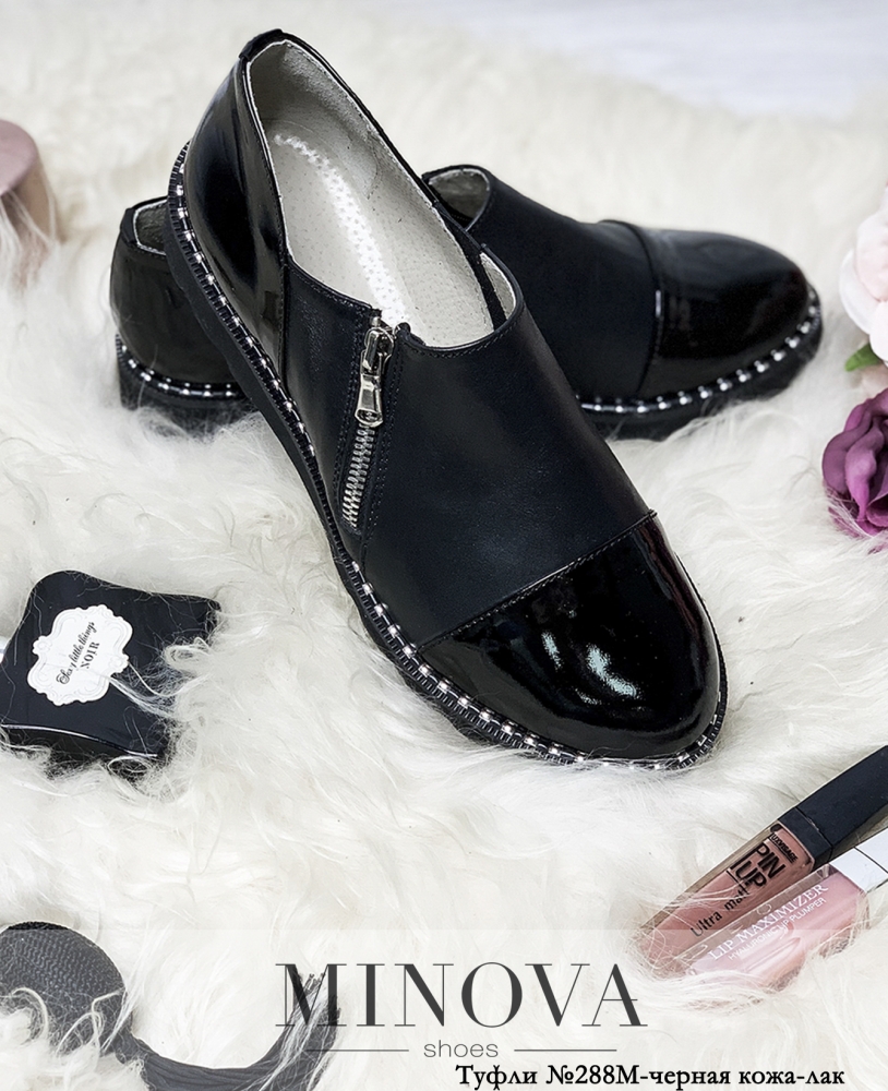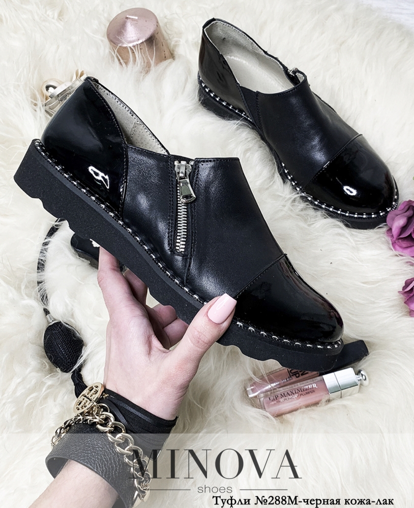 Закрытые кожаные туфли на утолщенной рифленой плоской подошве. В данной модели пятка и носок выполнены в лаковой коже. Шов подошвы украшен рантом. Внешняя сторона туфель на молнии.