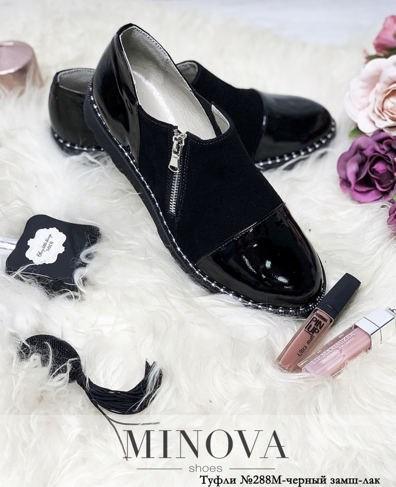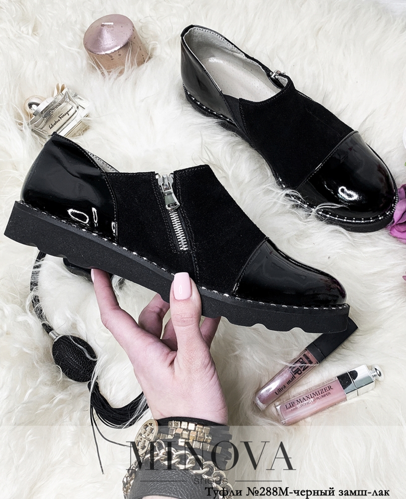 Закрытые замшевые туфли на утолщенной рифленой плоской подошве. В данной модели пятка и носок выполнены в лаковой коже. Шов подошвы украшен рантом. Внешняя сторона туфель на молнии.