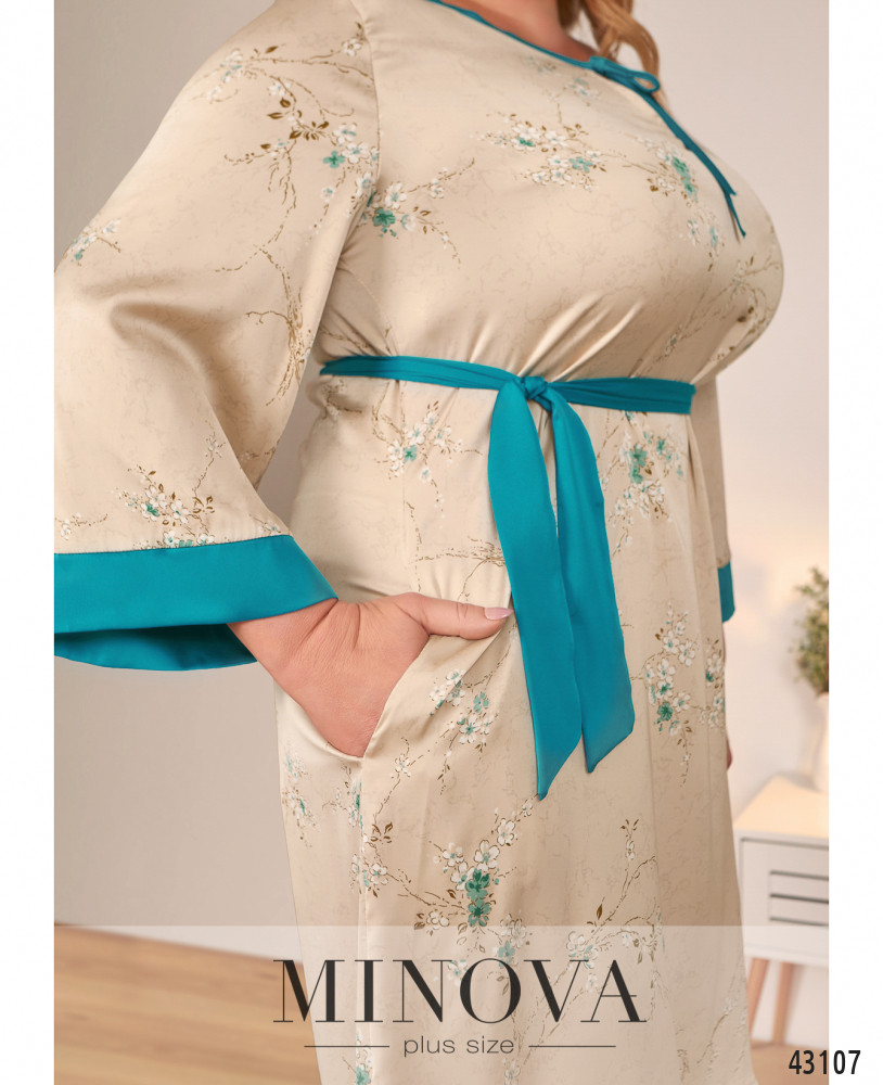Романтичное платье батал с полукруглым вырезом горловины и лентами под вырезом. Рукава фасона "кимоно", с манжетами. В наличии врезные карманы, застёжек нет. В комплекте пояс.