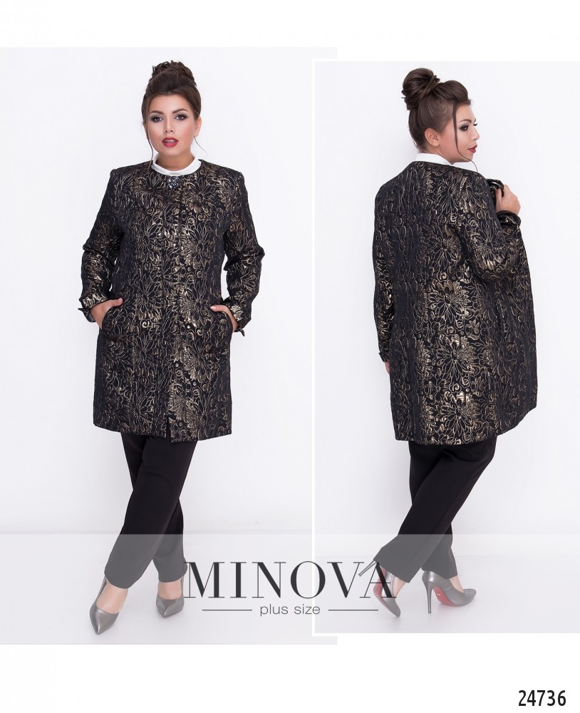 Легкий кардиган из жаккарда на подкладке. Кардиган с карманами, прямого кроя с четкой линией плеча благодаря подплечникам. Круглую горловину украшает крупная брошь-кнопка. Кардиган застегивается на пуговицы, скрытые в планке. Длинные рукава подворачиваются в манжеты с разрезами, что придает образу шика.