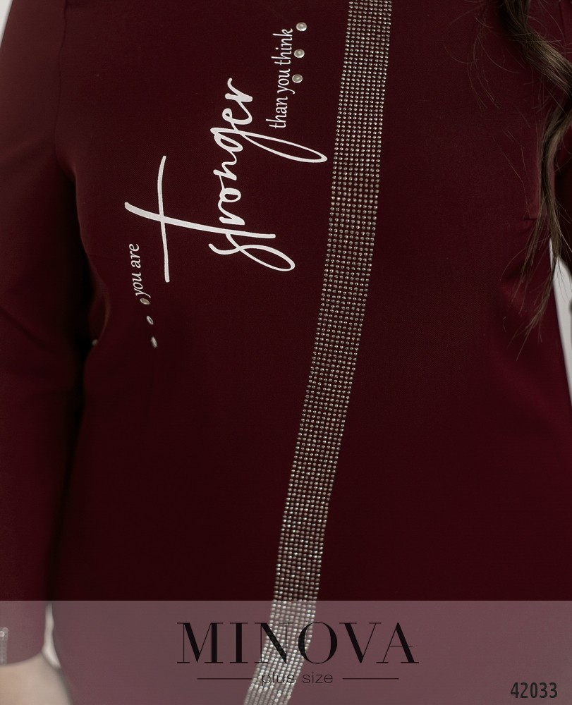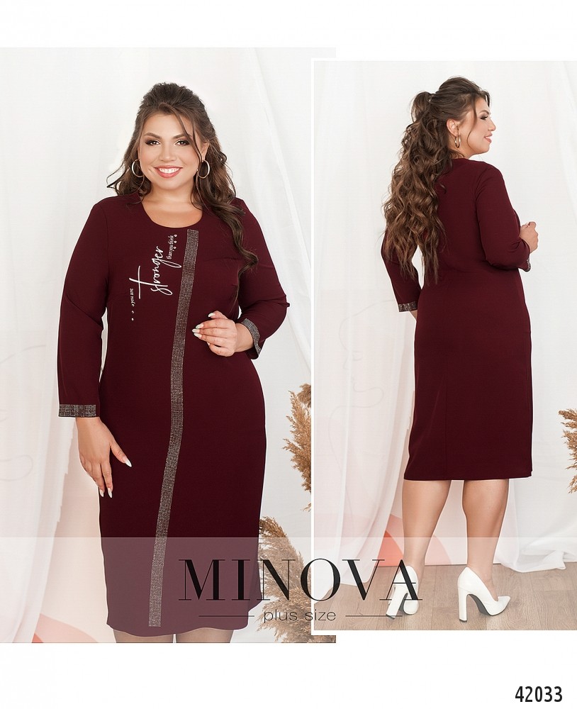 Нарядное платье батал без застёжек и карманов, с полукруглым вырезом горловины. На груди - декоративный принт, от горловины до низу - ряд мелких страз, такие же украшают рукава на манжетах (по внутренней стороне, прилегающей к телу, страз нет). На груди вытачки. Застёжек и карманов нет.