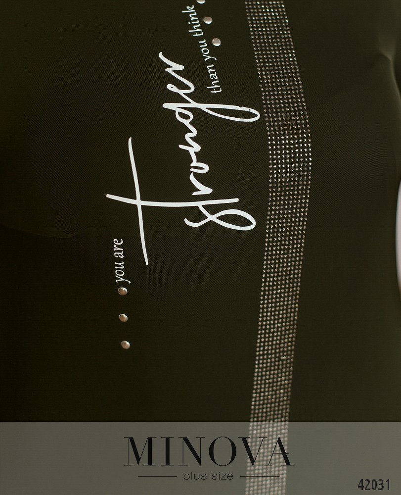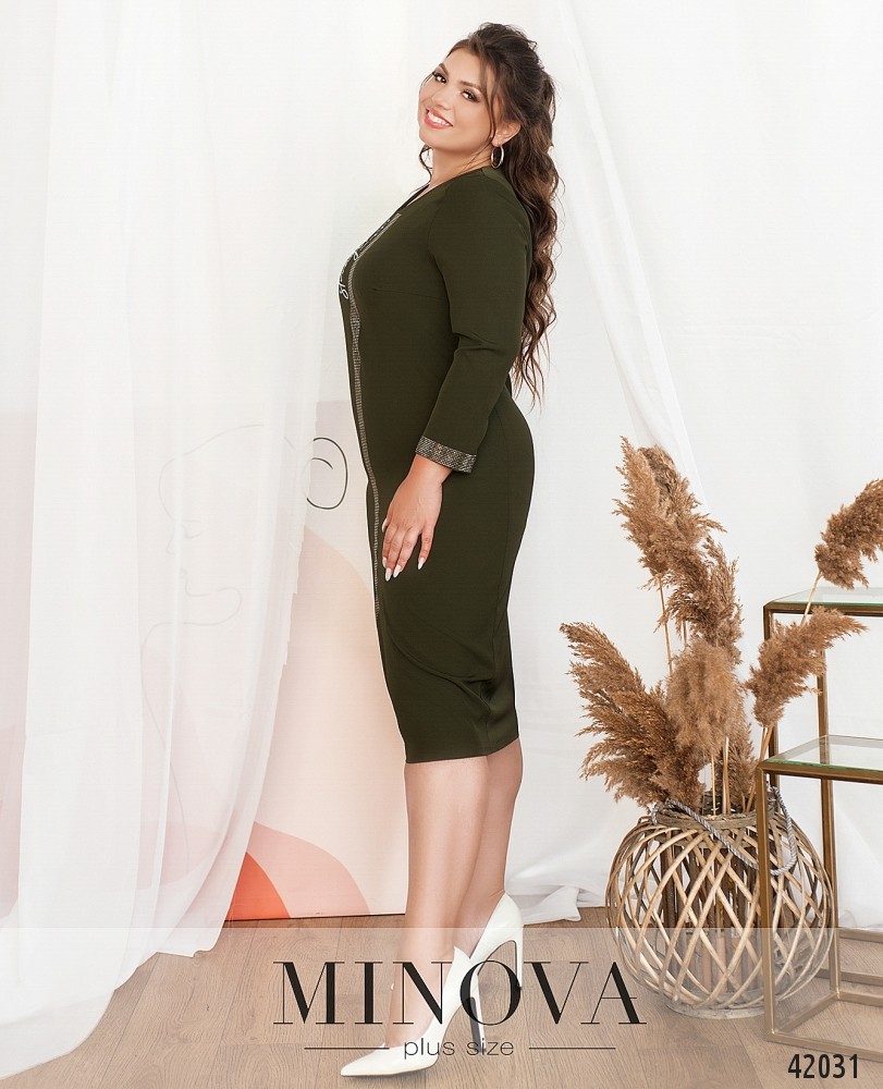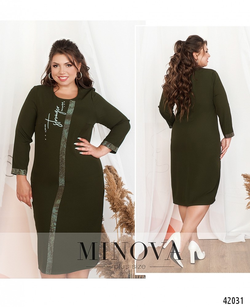 Нарядное платье батал без застёжек и карманов, с полукруглым вырезом горловины. На груди - декоративный принт, от горловины до низу - ряд мелких страз, такие же украшают рукава на манжетах (по внутренней стороне, прилегающей к телу, страз нет). На груди вытачки. Застёжек и карманов нет.