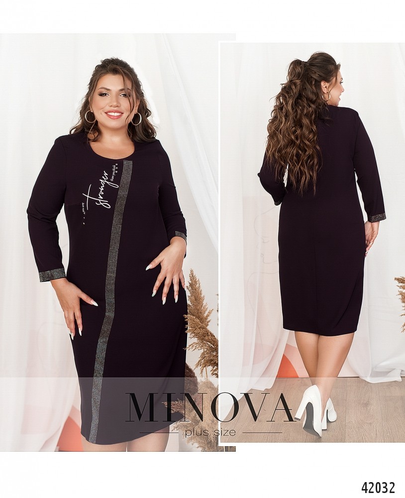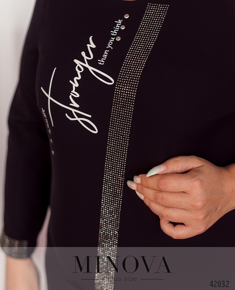 Нарядное платье батал без застёжек и карманов, с полукруглым вырезом горловины. На груди - декоративный принт, от горловины до низу - ряд мелких страз, такие же украшают рукава на манжетах (по внутренней стороне, прилегающей к телу, страз нет). На груди вытачки. Застёжек и карманов нет.