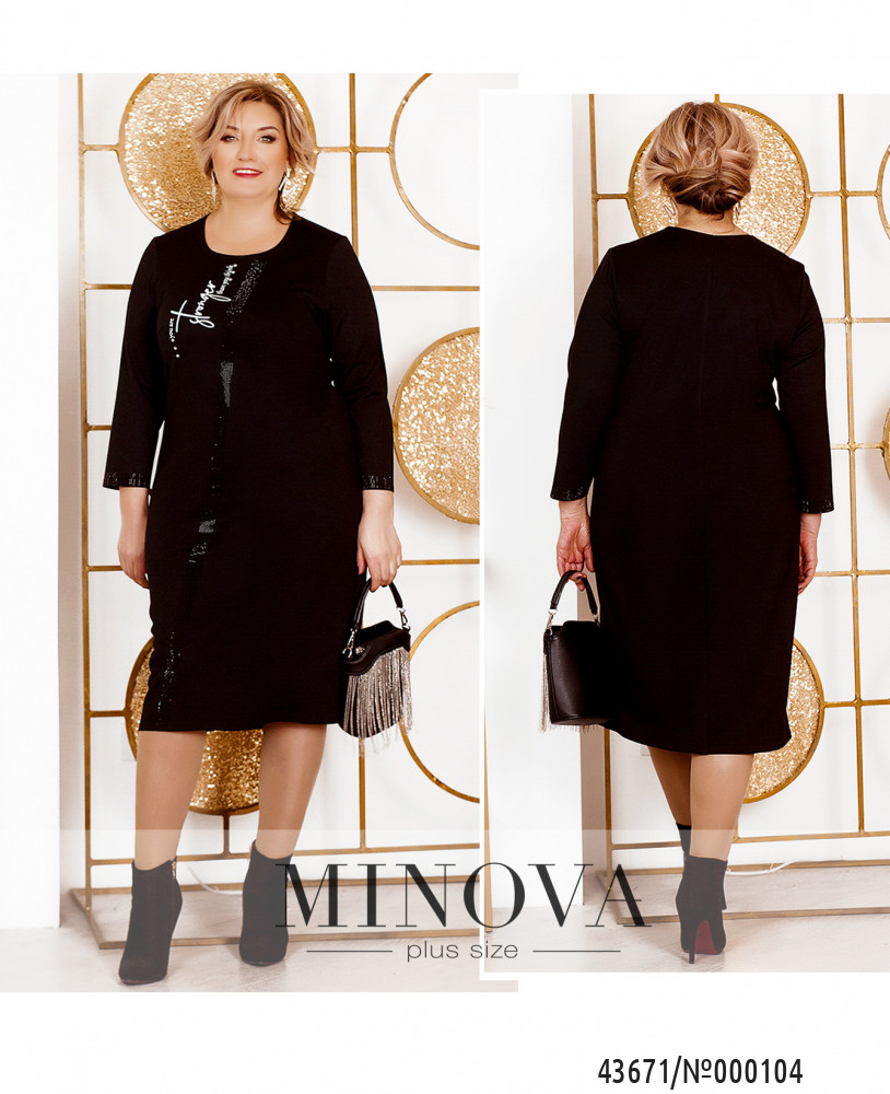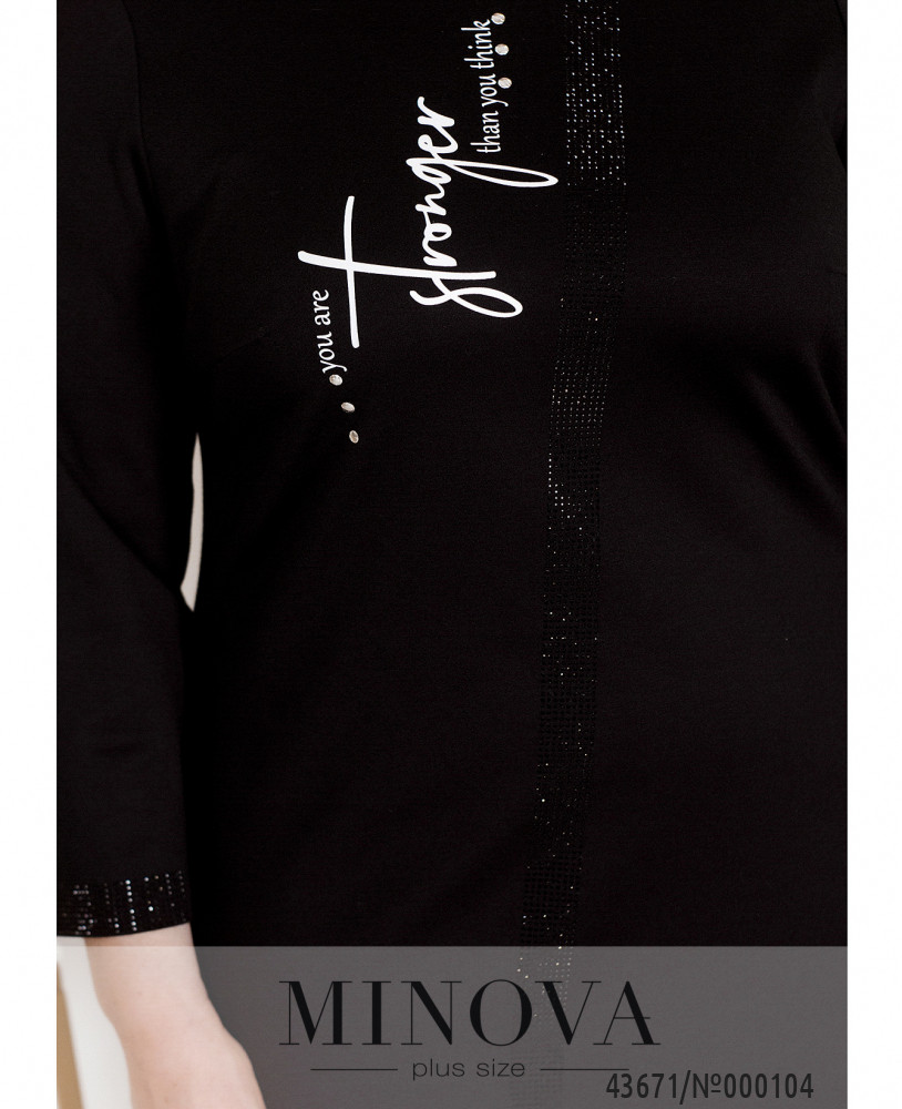 Стильное платье батал с принтом и продольной полосой из мелких кабошонов спереди, рукава на месте манжет также декорированы. На груди вытачки. Застёжек и карманов нет, вырез горловины полукруглый.