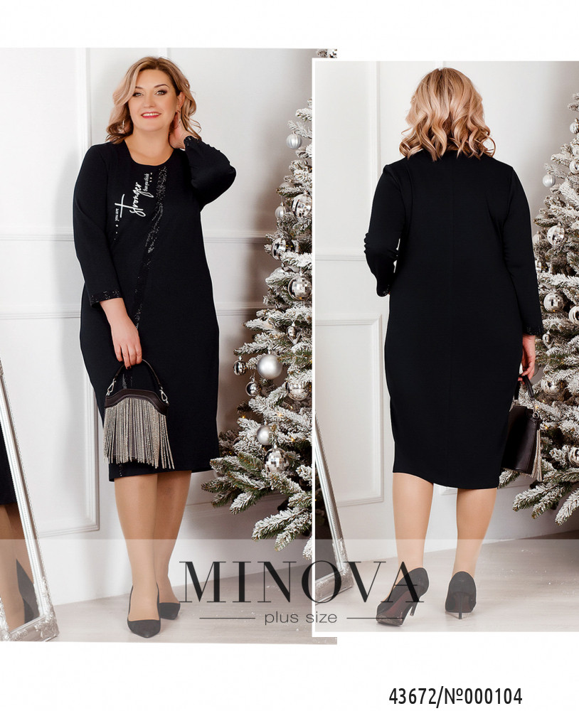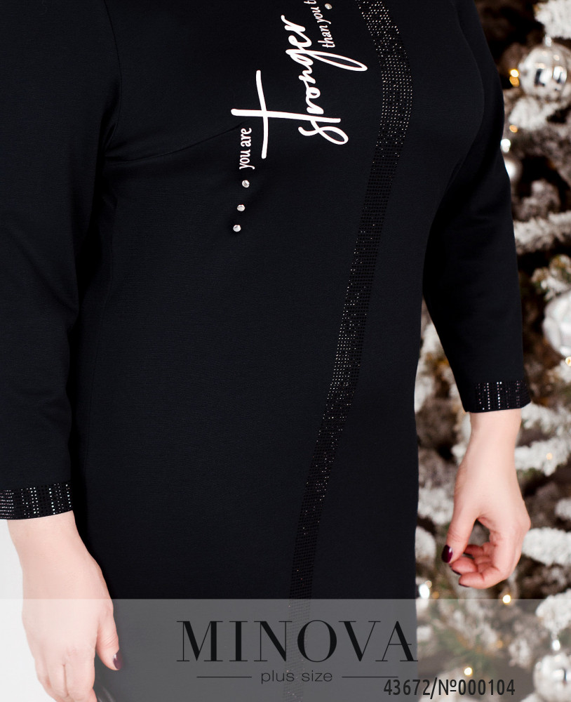 Стильное платье батал с принтом и продольной полосой из мелких кабошонов спереди, рукава на месте манжет также декорированы. На груди вытачки. Застёжек и карманов нет, вырез горловины полукруглый.