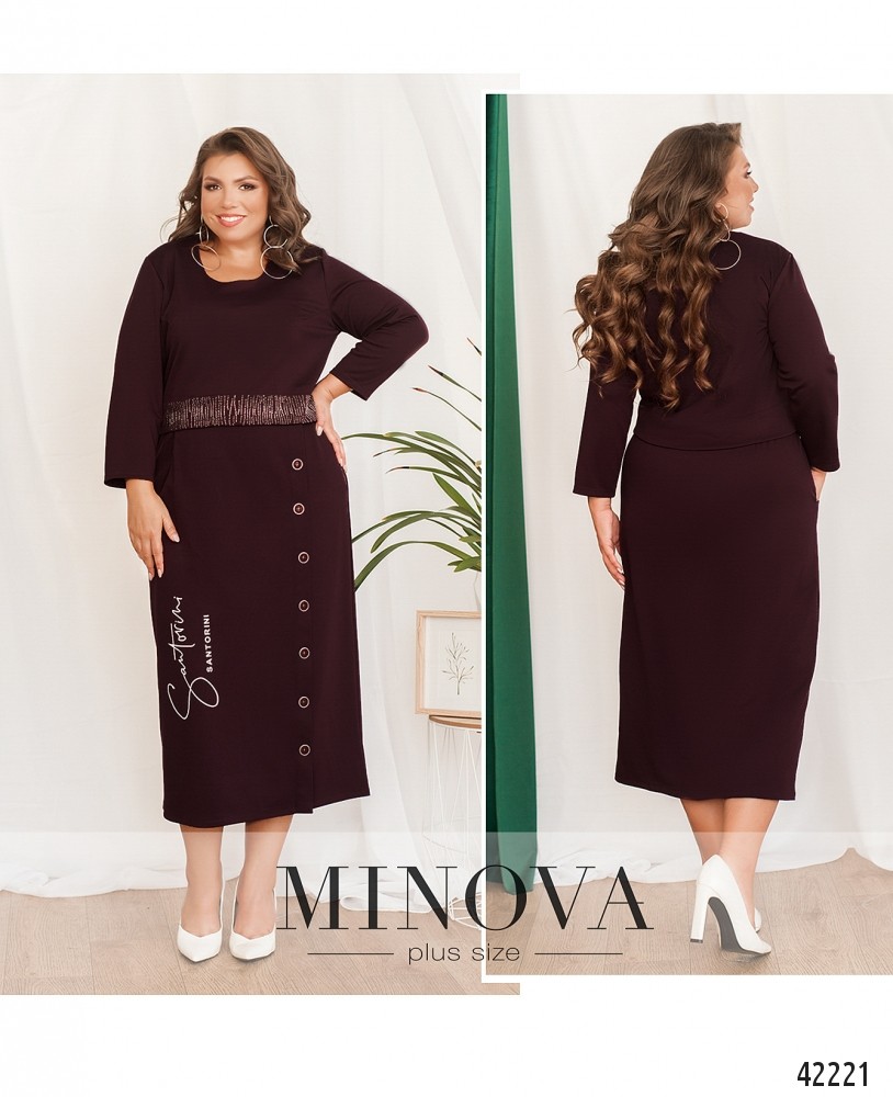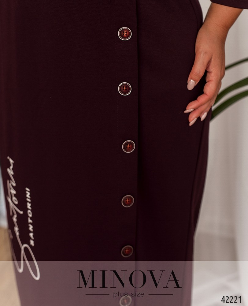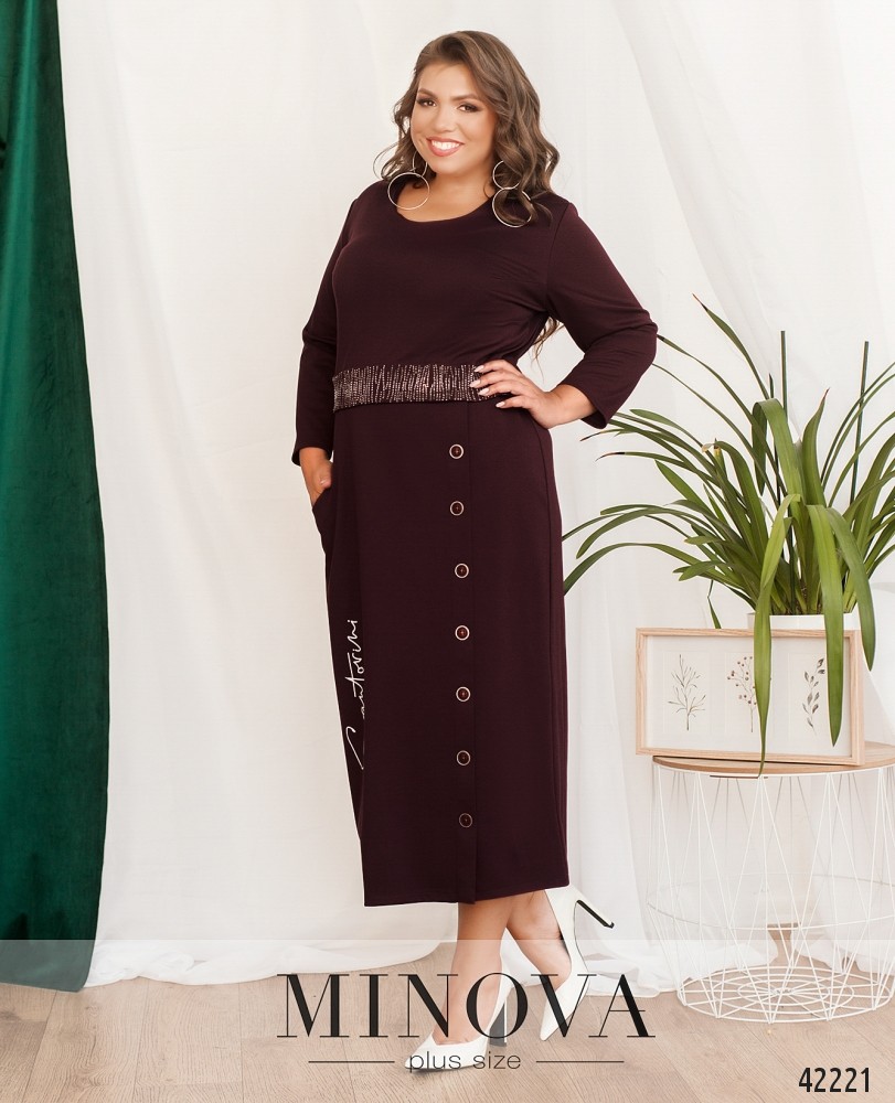 Элегантное платье батал с врезными карманами и полукруглым вырезом горловины. На талии - продольная планка, украшенная стразами. Рукава без манжет, на груди вытачки. Застёжек нет. На подоле - принт и декоративные пуговицы на планке.