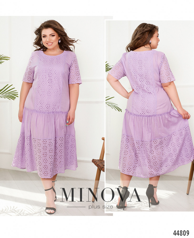 Нежное платье батал с ажурными вставками с перфорацией без подкладки. Вырез горловины полукруглый. Подол также украшен оборками и ажурным декором. На груди вытачки, застёжек и карманов нет. На спинке и на груди - продольные вставки с прошвой.