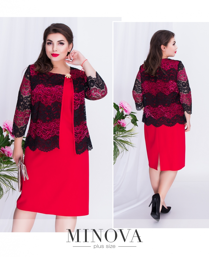 Прямое платье с кружевным жакетом с брошью и рукавом 3/4. Элегантный полупрозрачный фальш-жакет с круглой горловиной, длиной до линии бедра. Длина изделия закрывает колени. Небольшой разрез сзади не сковывает движения.