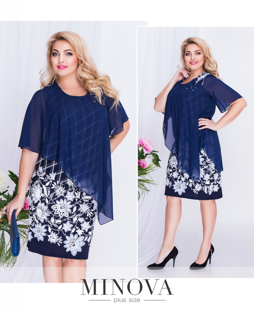 Прямое платье длиной до колена с ассиметричной прозрачной накидкой с бантом и рукавом до локтя. На плече накидка украшена бантом и стразами, диагональный подол накидки закрывает бедро. Небольшой разрез сзади не сковывает движения.