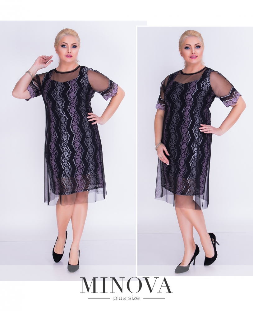 Двухслойное кружевное платье с легкой накидкой из фатина. Первый слой состоит из трикотажного прямого платья на подкладке без рукавов с квадратным декольте. Сверху надевается прозрачная фатиновая накидка с короткими рукавами, отороченными кружевной лентой.