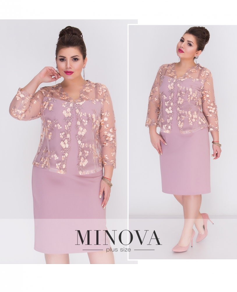 Платье по фигуре с кружевной накидкой. Расклешенная кружевная накидка с вышивкой пришита к платью. Рукав ¾. На спинке платье застегивается на скрытую молнию.