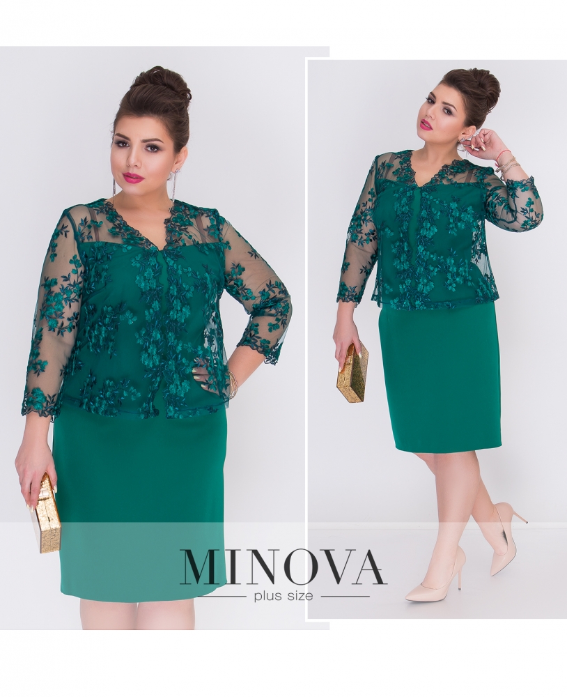 Платье по фигуре с кружевной накидкой. Расклешенная кружевная накидка с вышивкой пришита к платью. Рукав ¾. На спинке платье застегивается на скрытую молнию.