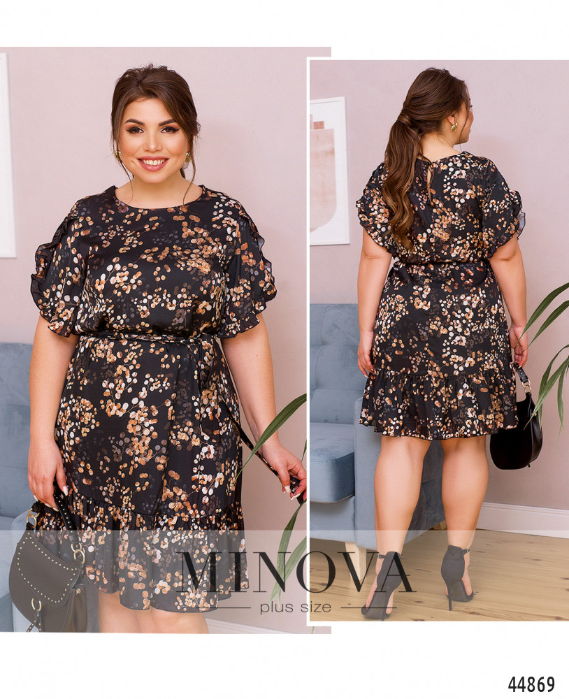 Нежное и яркое платье батал с полукруглым вырезом горловины и пуговкой-застёжкой сзади под шеей. Рукава-лепестки, ниспадают оборками на запАх. Карманов нет. На подоле оборки.