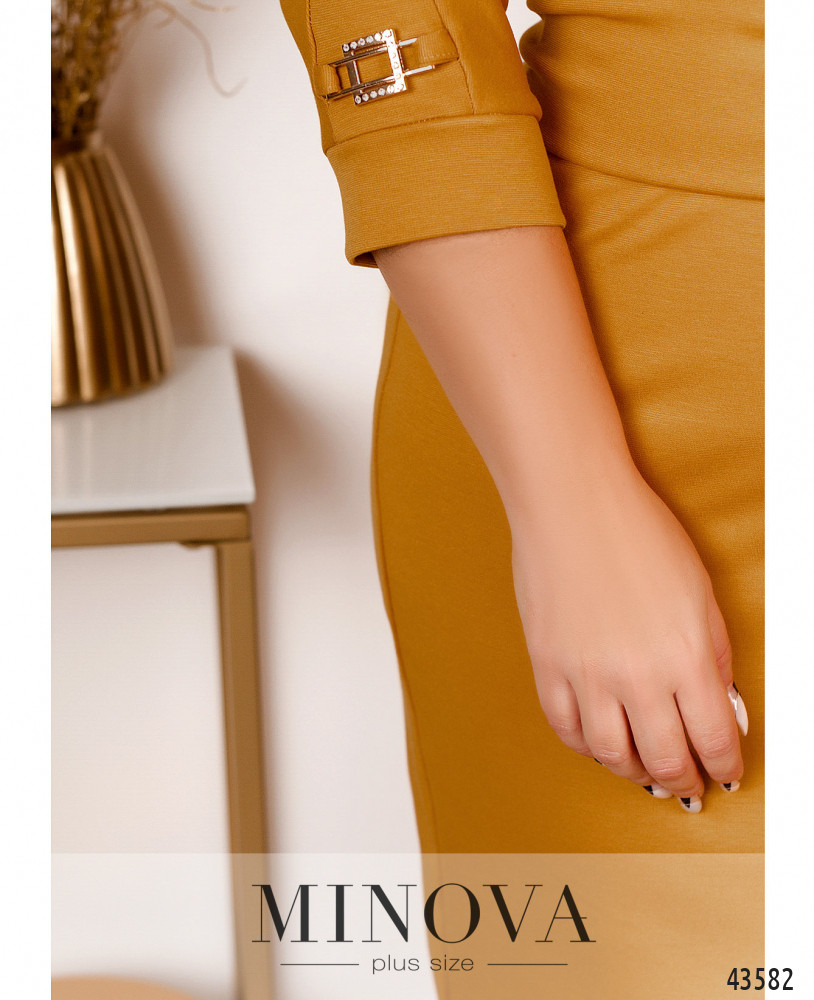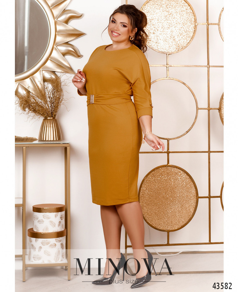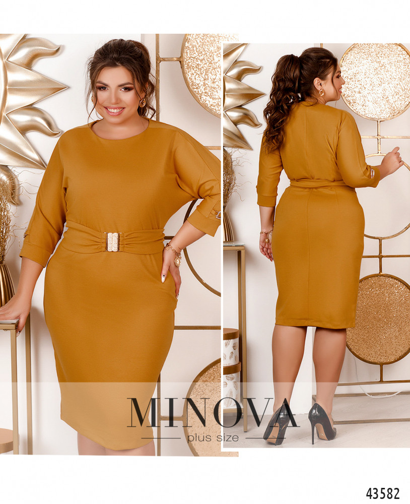 Минималистичное платье плюс сайз с декоративными нашивками на рукавах, без застёжек и карманов. В наличии пояс со стильной крупной пряжкой. Рукава с мягкими манжетами. Силуэт приталенный.