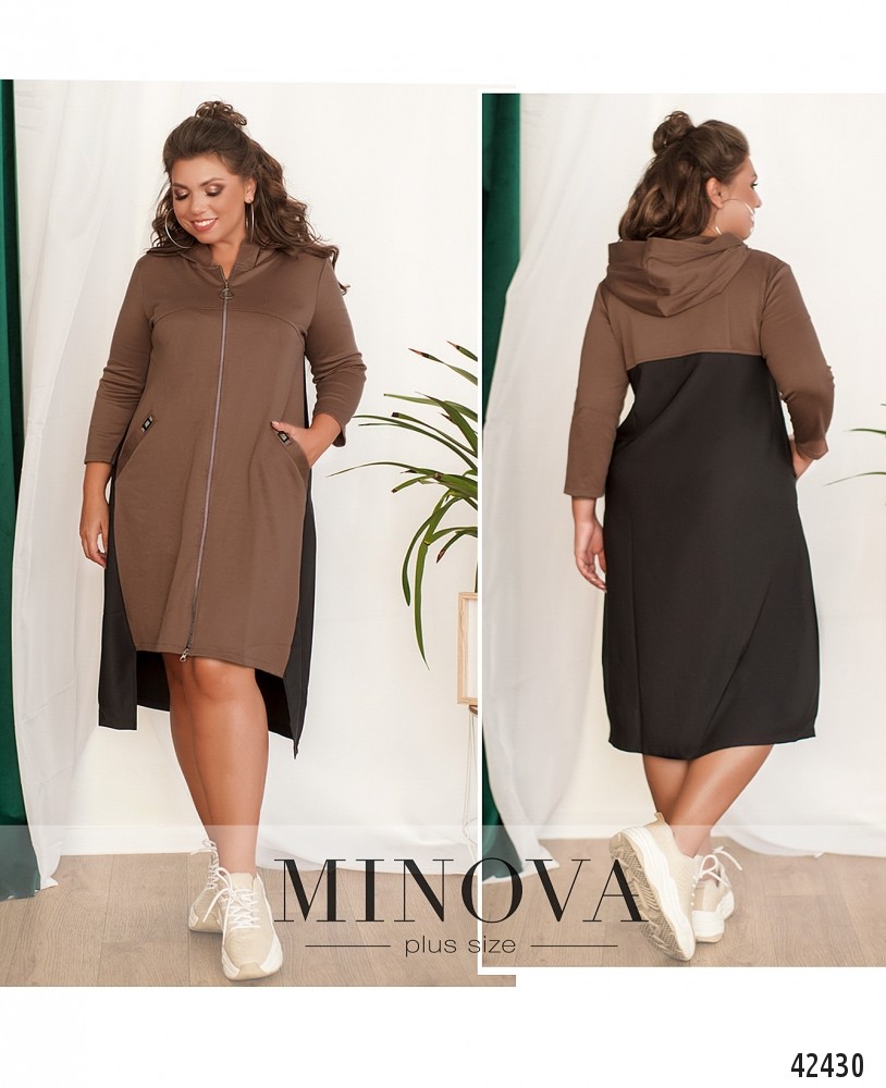 Длинное платье батал с капюшоном и молнией по центру, застёгивается на два бегунка: круглый сверху и стандартный снизу. По бокам - врезные карманы с декоративными пряжками. Подол асимметричный, по спинке длиннее. Без подкладки. Рукава без манжет.