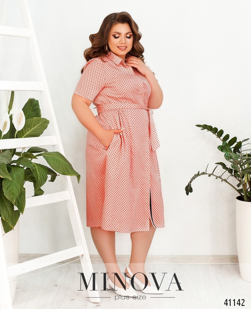 Изящное платье батал в мелкий горох, в комплекте - пояс. Застёгивается на пуговицы спереди от отложного воротничка до низа. Пуговицы прикрываются верхней планкой. По бокам - врезные карманы. Подол присобран мягкими оборками от боков и по спинке. Рукава без манжет.