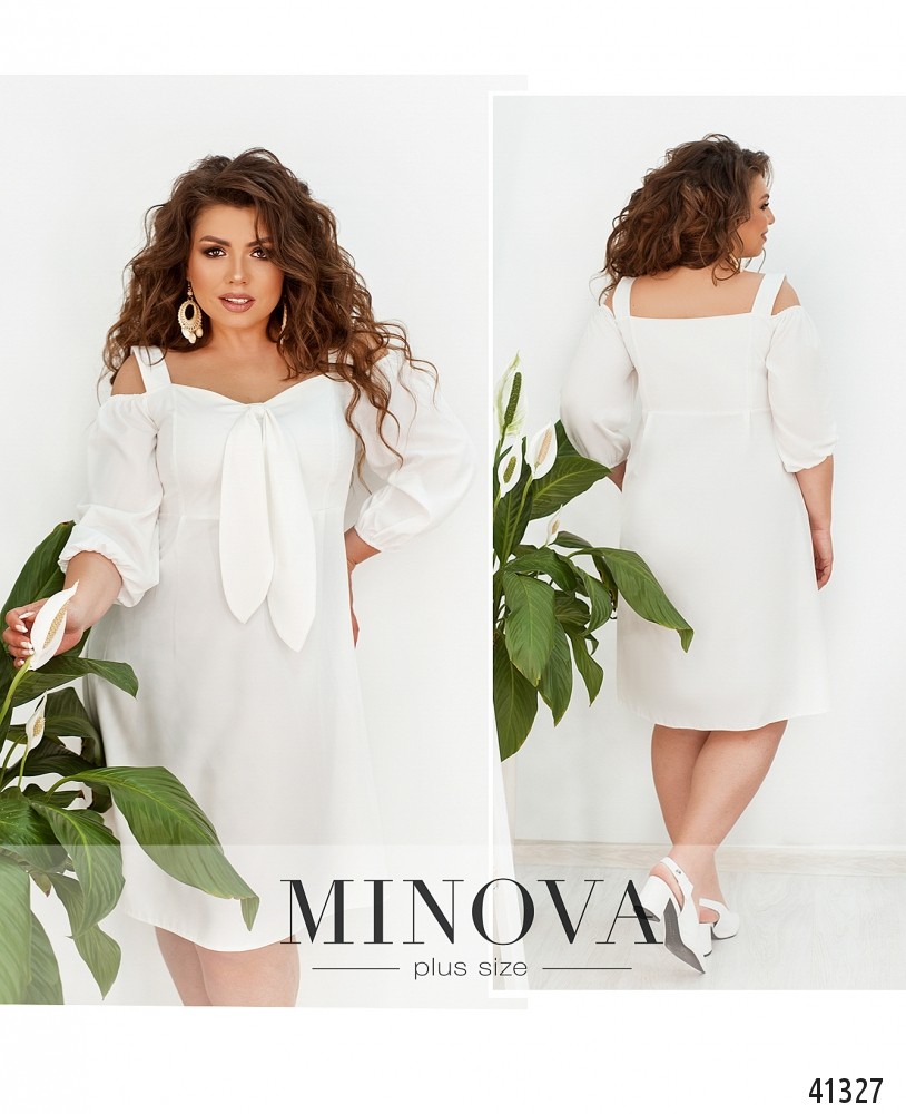 Оригинальное платье батал с широкими бретелями, плечи приоткрыты, рукава со вшитыми резинками сверху и снизу. Спереди подшит бант. Подол подшит к лифу. На талии вытачки. Без карманов, застёгивается на молнию, вшитую слева.