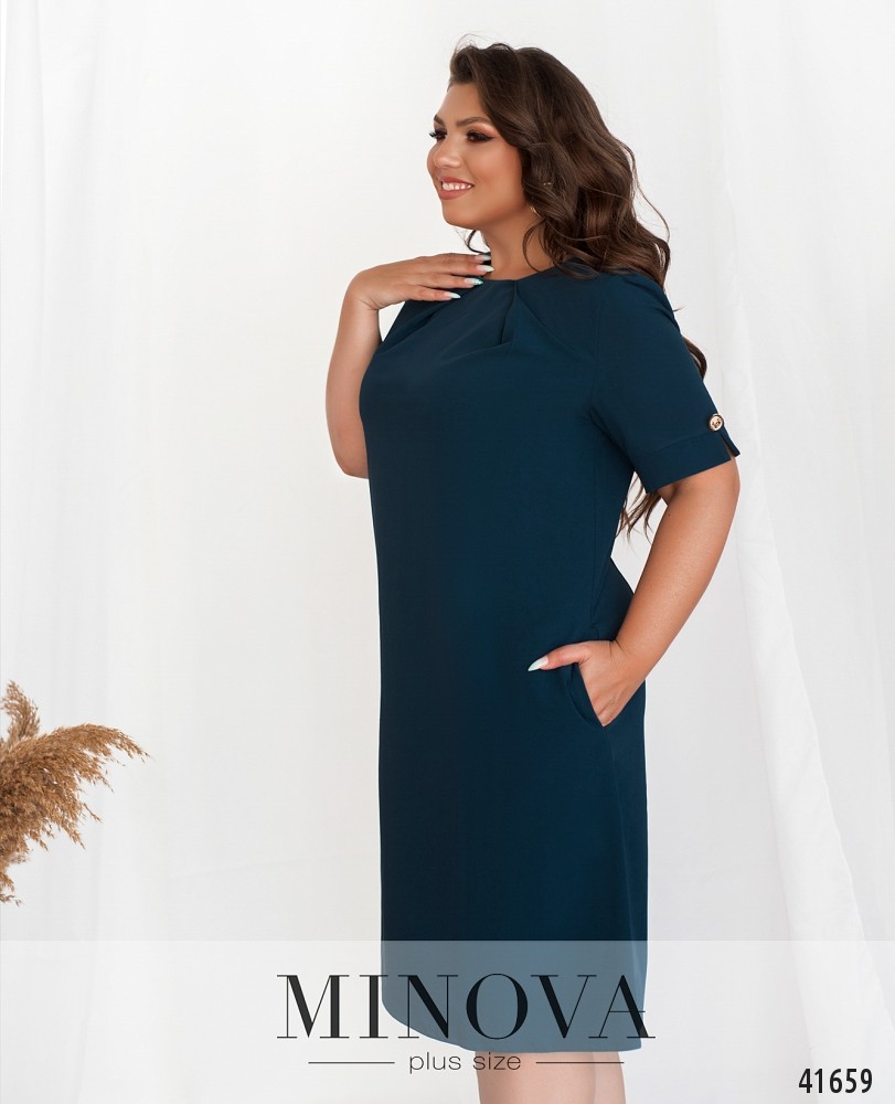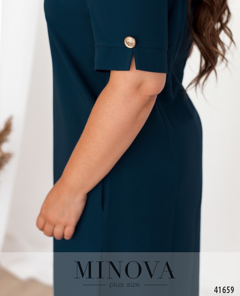 Элегантное платье батал с декоративными пуговицами на рукавах. Вырез горловины неглубокий, полукруглый. Ткань от выреза спускается оборками. Силуэт приталенный, по бокам - врезные карманы. Застёгивается на молнию, вшитую по спинке.