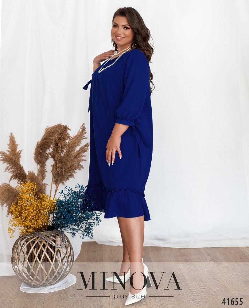 Очаровательное платье батал с оборками на подоле, вырез горловины полукруглый, ткань под ним присобрана, платье с приталенным силуэтом. Рукава с манжетами, на манжетах завязываются ленты. Снизу под верхним слоем - мягкая подкладочная ткань. Без застёжек и карманов.