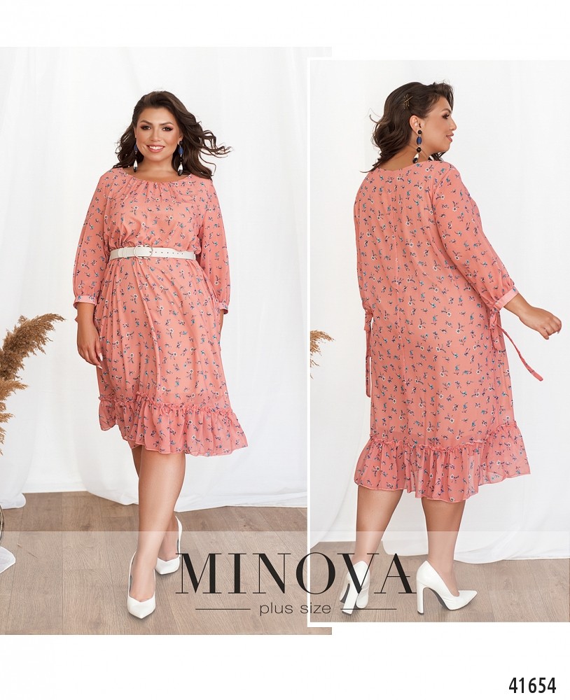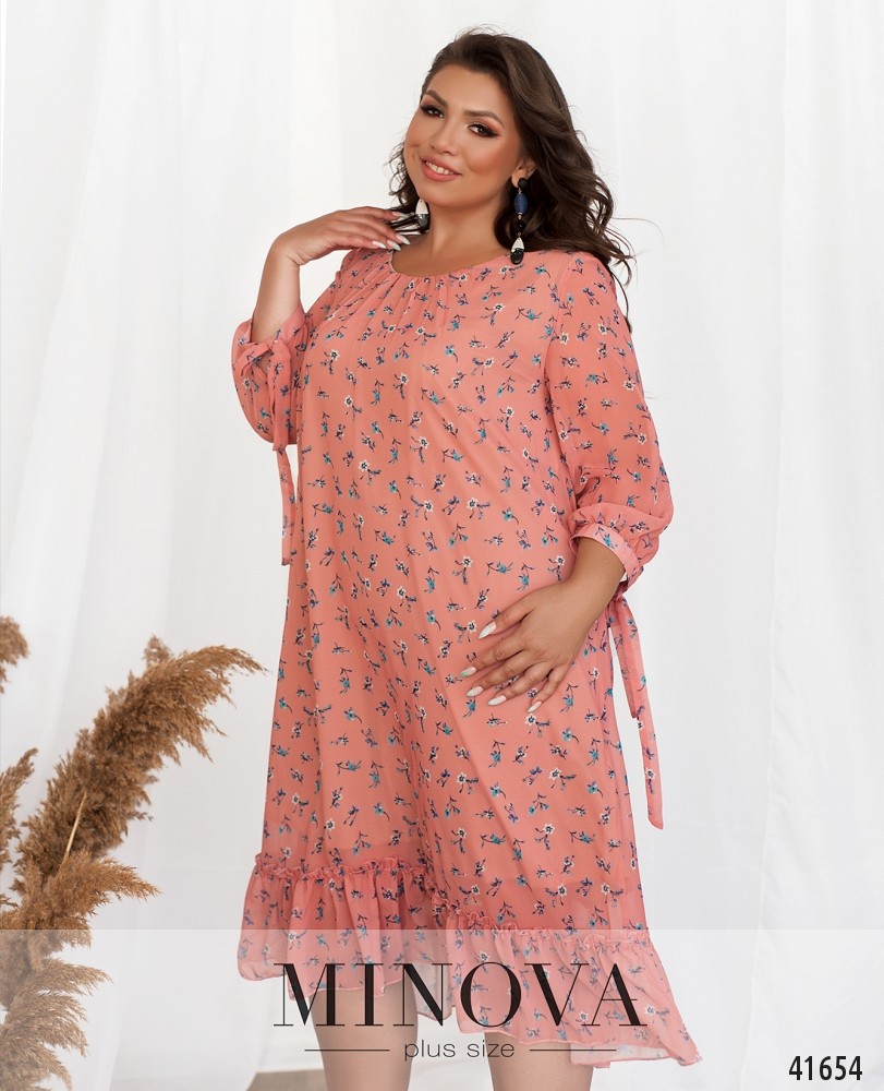 Очаровательное платье батал с оборками на подоле, вырез горловины полукруглый, ткань под ним присобрана, платье с приталенным силуэтом. Рукава с манжетами, на манжетах завязываются ленты. Снизу под верхним слоем - мягкая подкладочная ткань. Без застёжек и карманов.