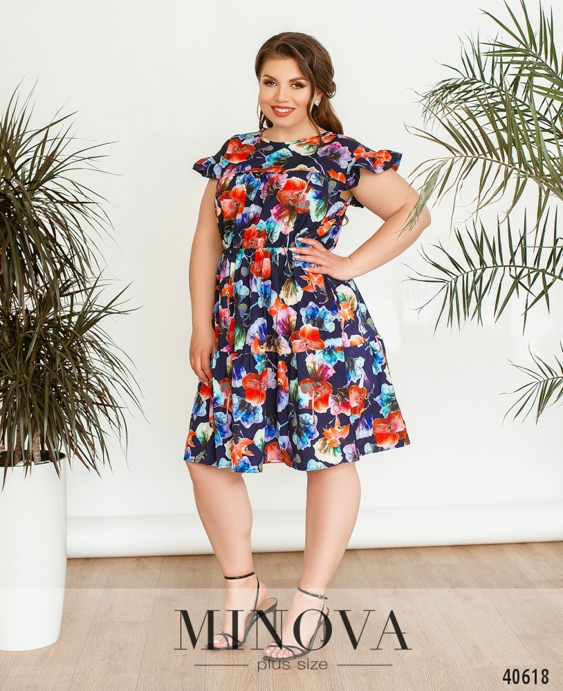 Яркое, нарядное и женственное платье батал с цветочным принтом. Рукава-крылышки, короткие, с оборками. Вырез горловины полукруглый. Подол с оборками, подшит к лифу и расклешён. Без застёжек и карманов, сзади под шеей - две ленты-завязки.