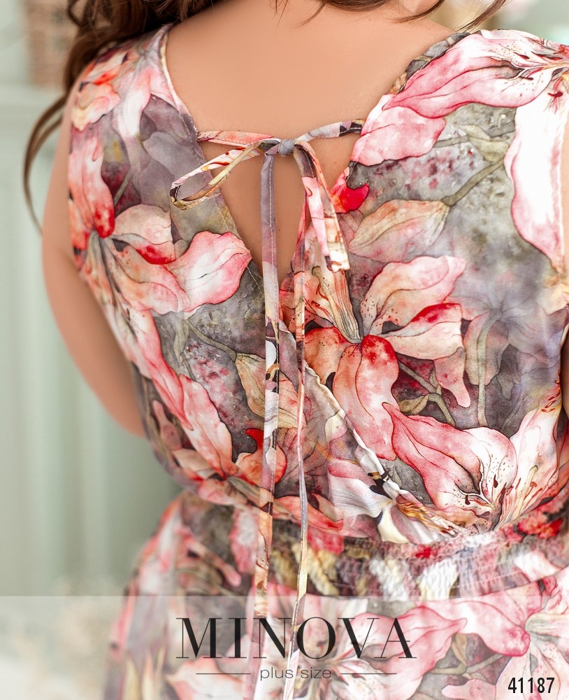 Яркое женственное платье большого размера со вшитой в пояс тугой резинкой. Верх подшит на запАх, оборки-бретели свободные, сзади можно подвязать на шнурки. Застёжек и карманов нет. Подол снизу украшен оборками.