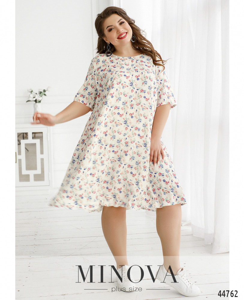 Оригинальное платье батал с оборками на подоле, подшитыми сзади. Вырез горловины полукруглый, рукава без манжет, застёжек и карманов нет.