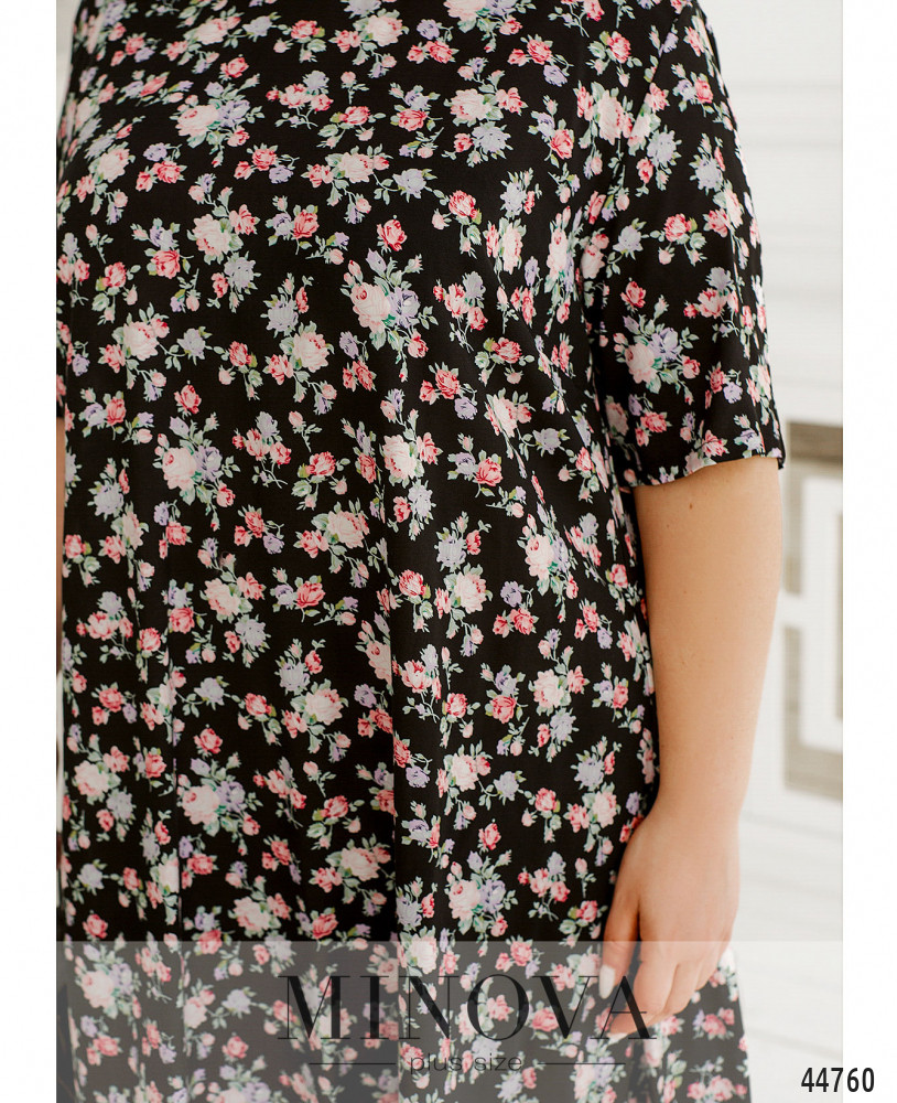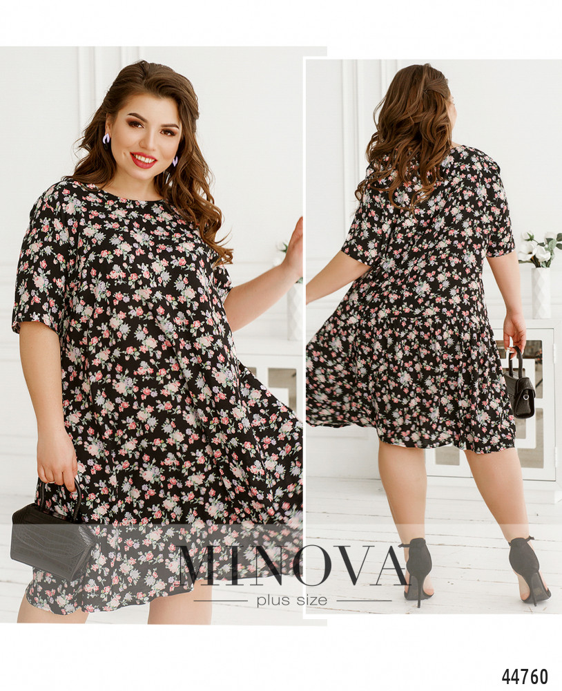 Оригинальное платье батал с оборками на подоле, подшитыми сзади. Вырез горловины полукруглый, рукава без манжет, застёжек и карманов нет.