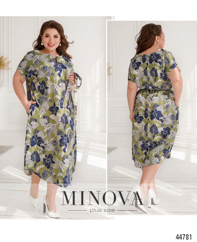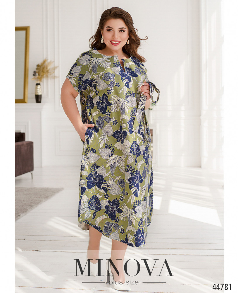 Яркое и нарядное платье батал с принтом, вырез горловины - полукруглый с V-образным углублением. По бокам - карманы в шве, застёжек нет, рукав фасона "летучая мышь".
