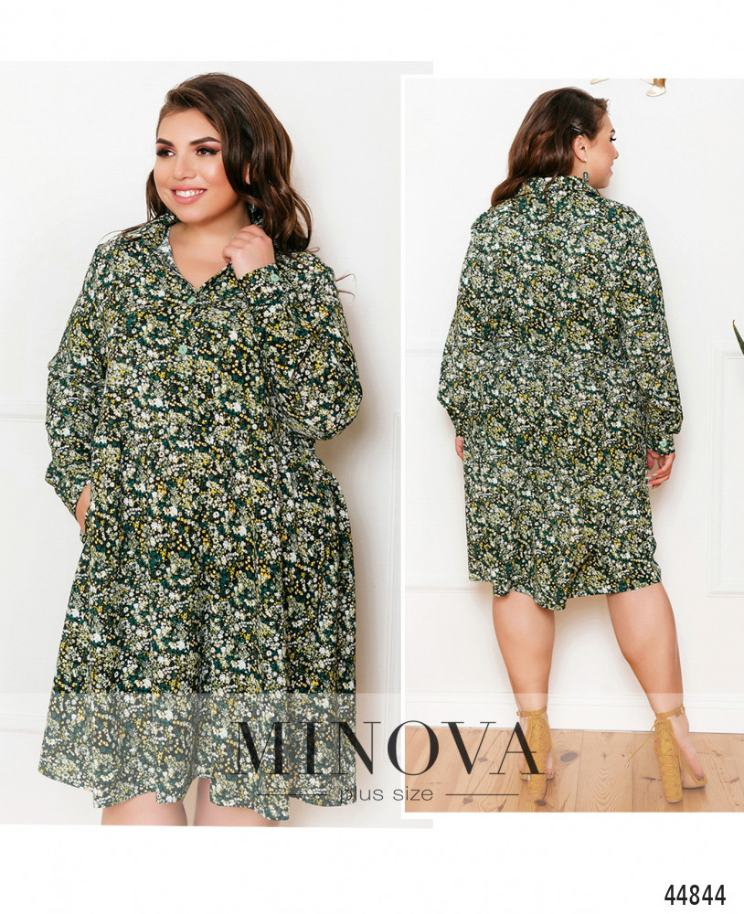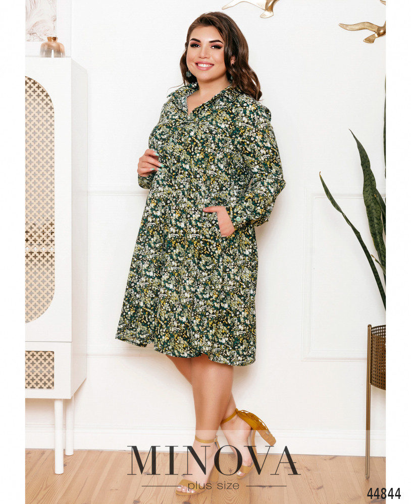 Яркое и стильное платье батал, пуговицы от отложного воротничка до талии. Подол ниспадает мягкими оборками. На левой стороне груди - накладной карман. По бокам - карманы в шве. Рукава с манжетами, на манжетах по одной пуговке.