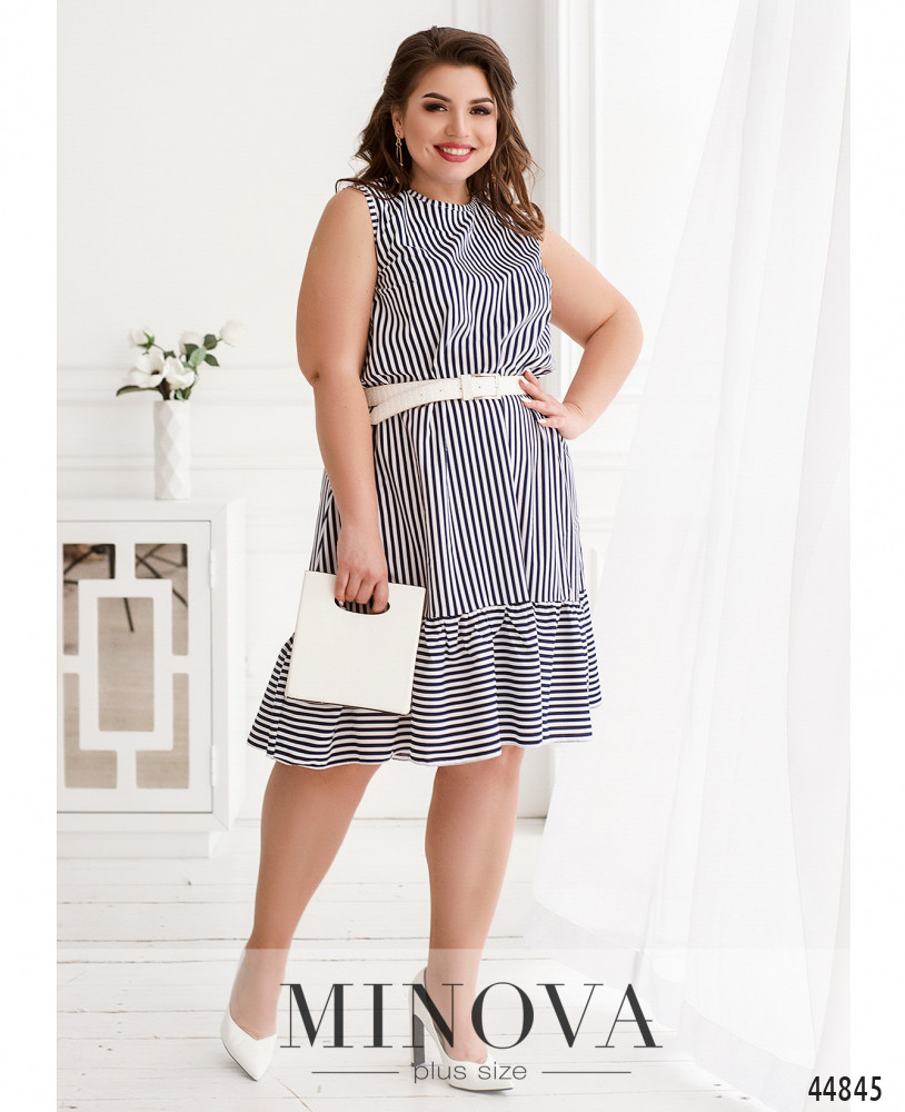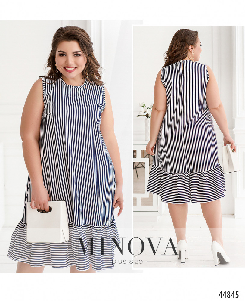 Стильное платье плюс сайз с полукруглым вырезом горловины, застёжка - пуговка сзади под шеей, без рукавов, на груди вытачки, на подоле оборки. Без карманов.