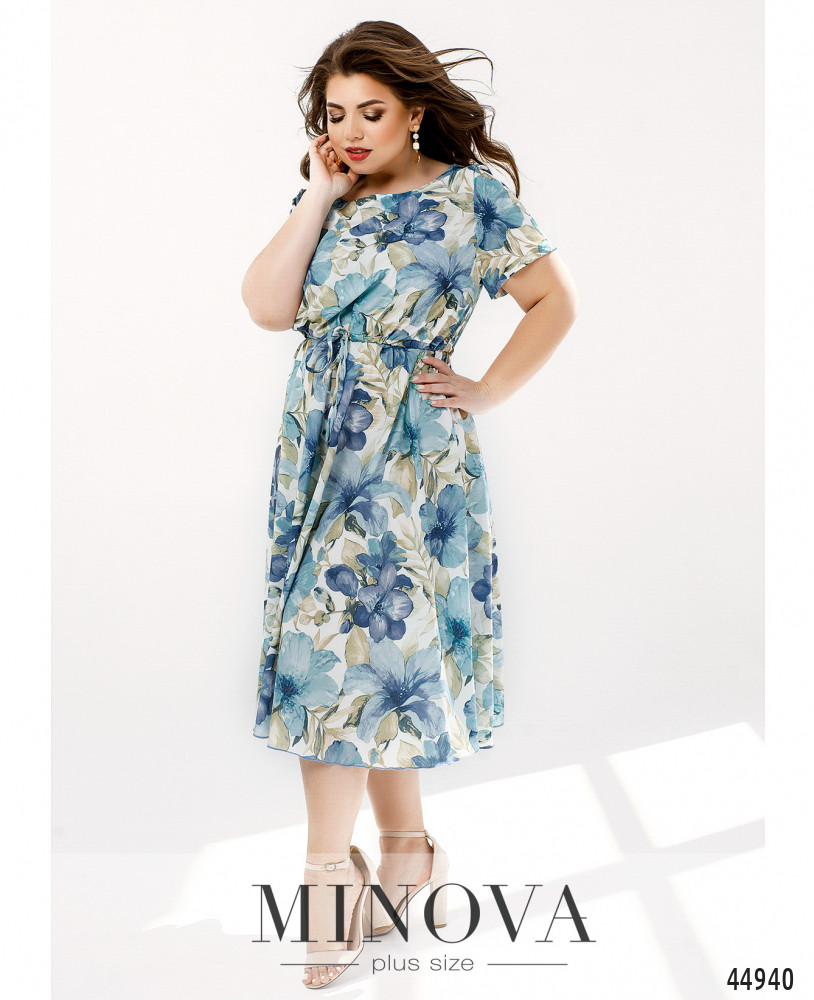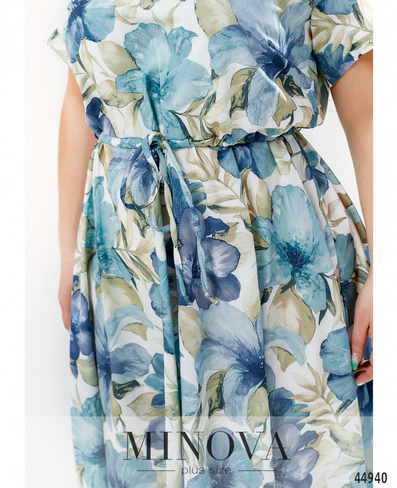 Стильное платье большого размера с коротким рукавом, без застёжек и карманов, с широким полукруглым вырезом горловины. Через талию пропущен шнурок под кулиской, подол ниспадает мягкими оборками.