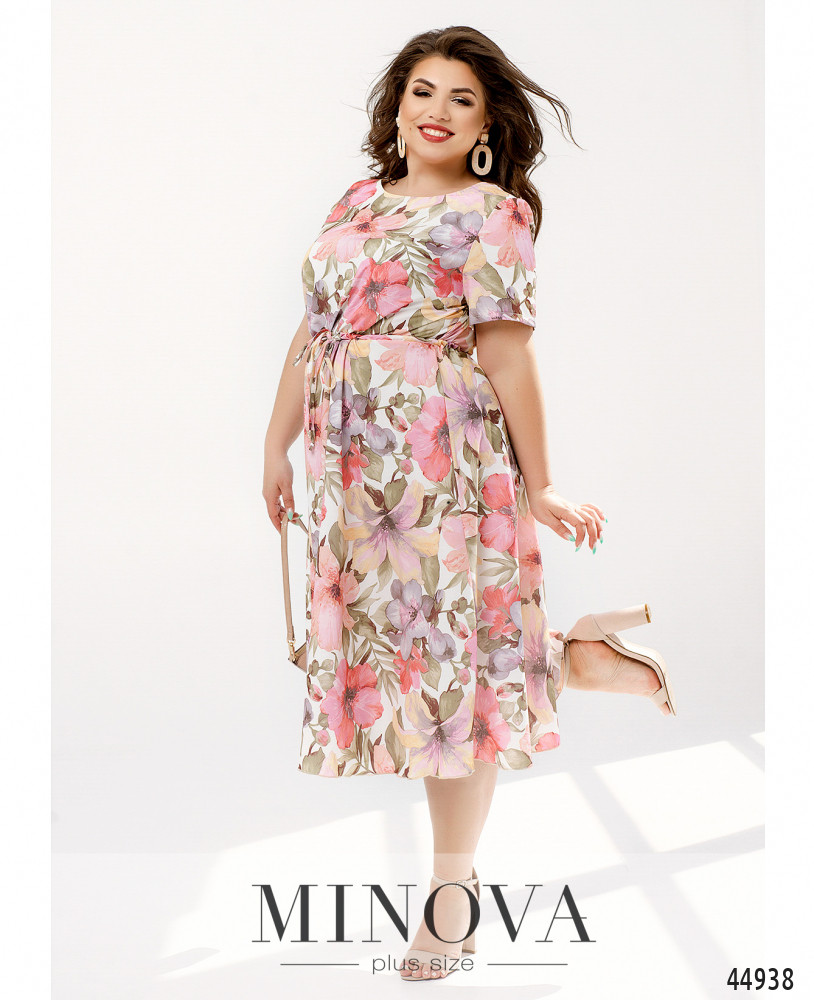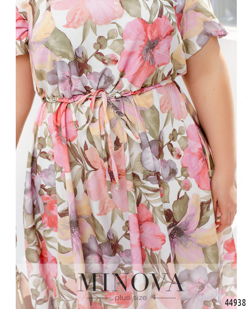 Стильное платье большого размера с коротким рукавом, без застёжек и карманов, с широким полукруглым вырезом горловины. Через талию пропущен шнурок под кулиской, подол ниспадает мягкими оборками.