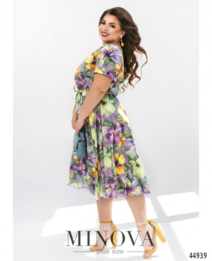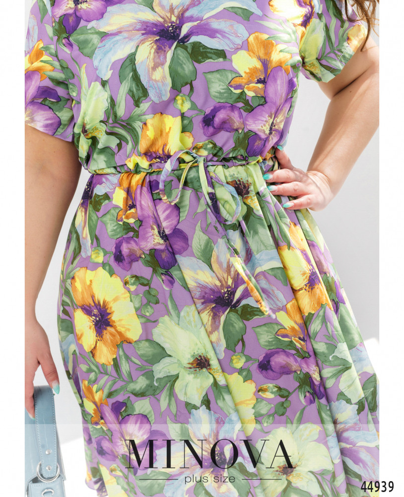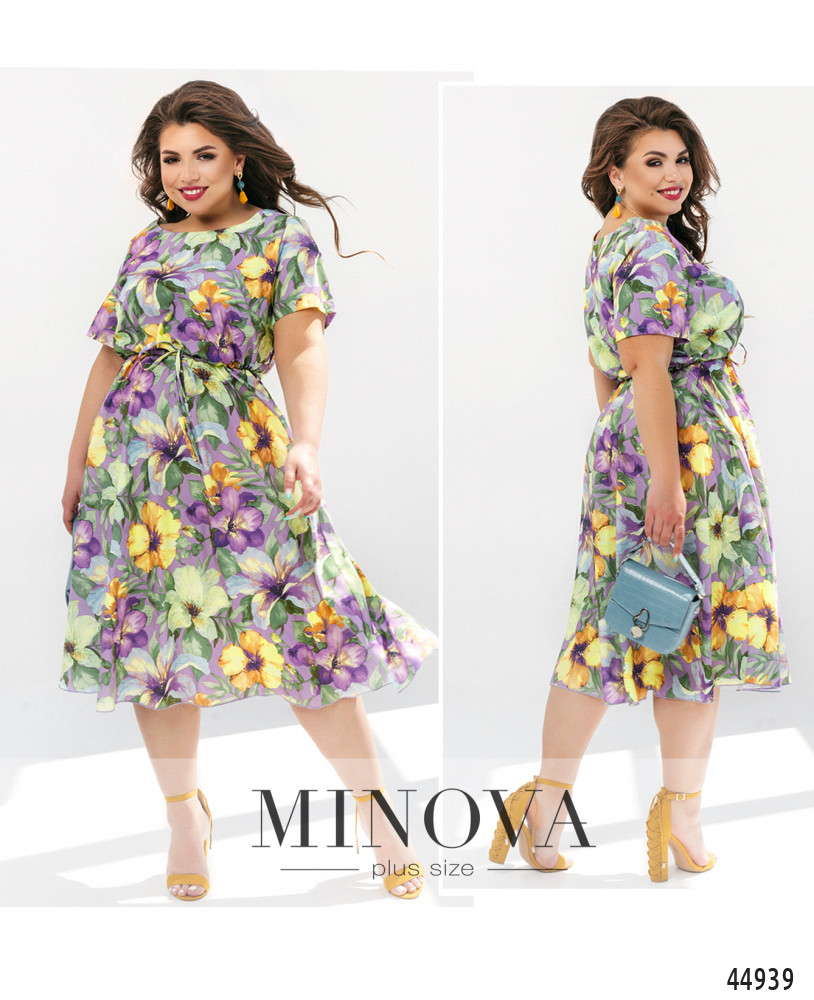 Стильное платье большого размера с коротким рукавом, без застёжек и карманов, с широким полукруглым вырезом горловины. Через талию пропущен шнурок под кулиской, подол ниспадает мягкими оборками.