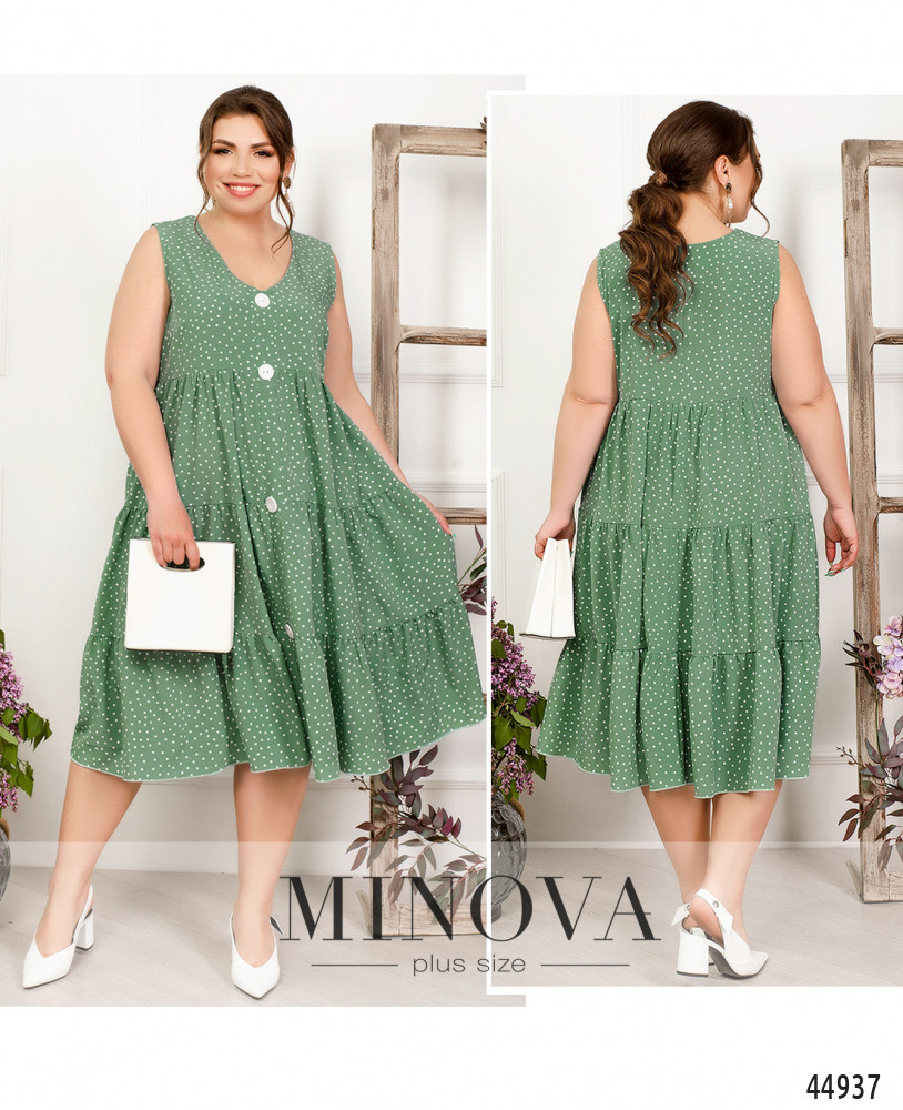 Нежное платье батал с декоративными пуговицами спереди на планке, без рукавов, на широких бретелях. Вырез горловины - смягчённый V-образный. Подол подшит несколькими рядами оборок. Застёжек и карманов нет.