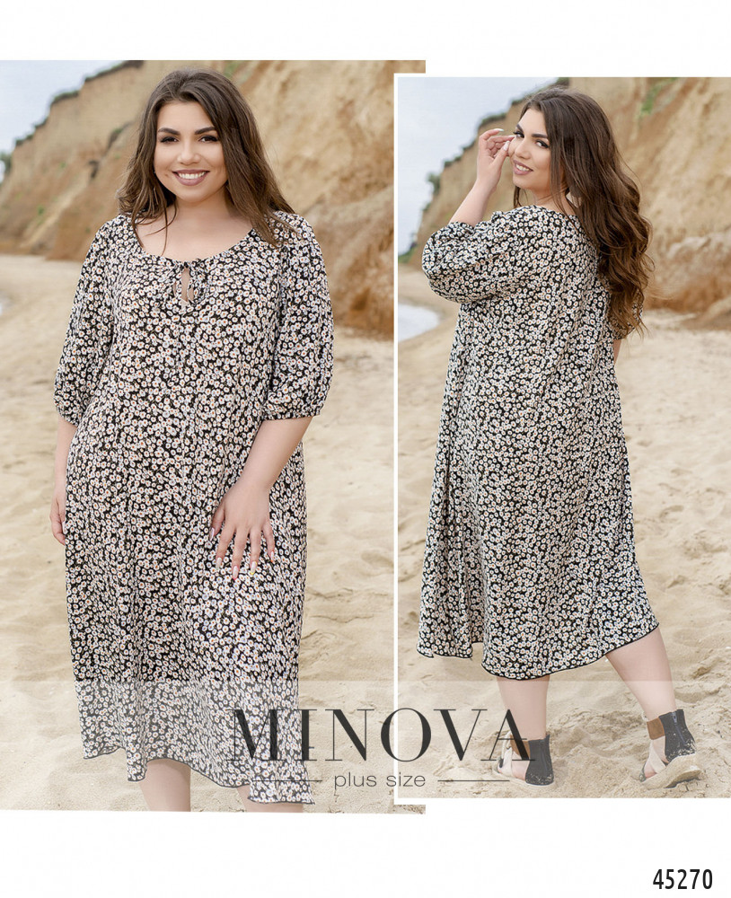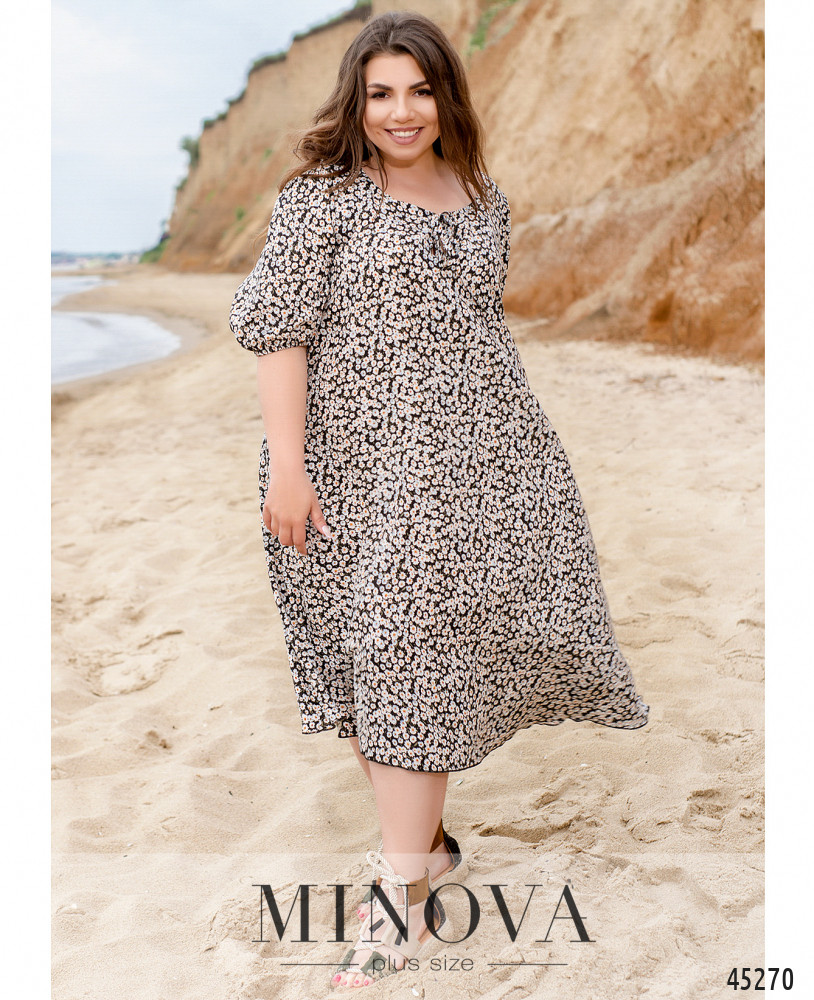 Универсальное женственное платье миди трапециевидного силуэта с цветочным принтом подчеркнёт красоту каждой его обладательницы. Воздушные рукава длиной 3/4 на резинках и полукруглый вырез горловины с декоративными завязками сделают ваш образ изящным и романтичным.