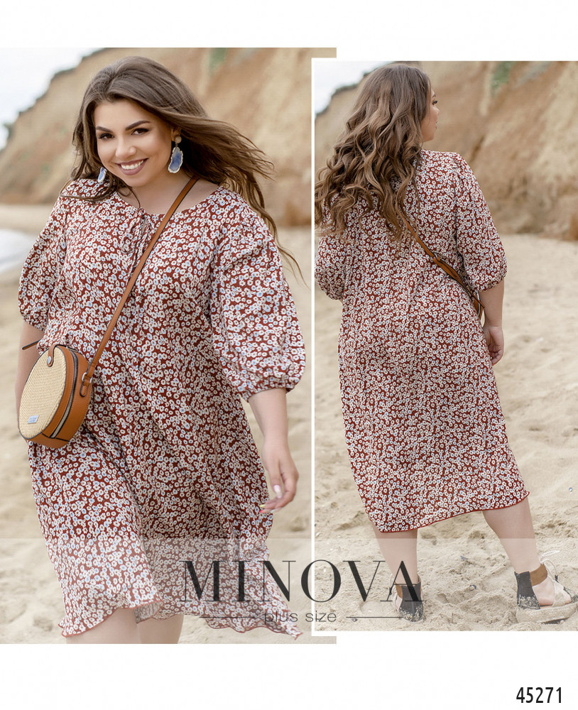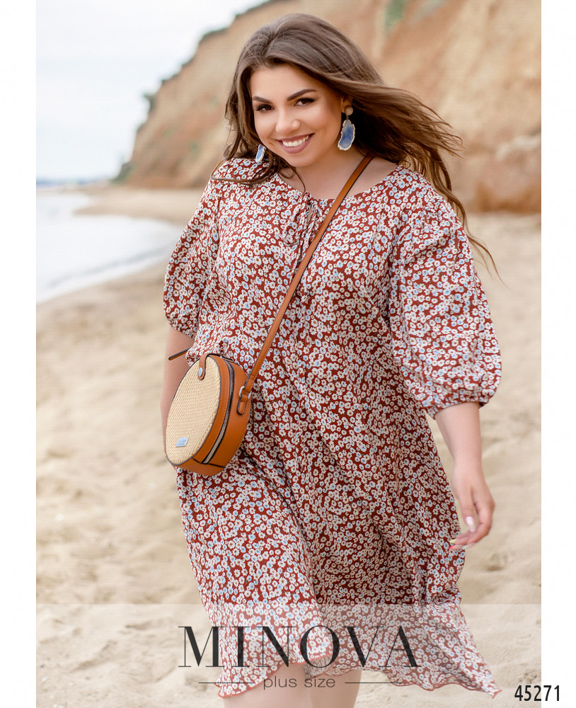 Универсальное женственное платье миди трапециевидного силуэта с цветочным принтом подчеркнёт красоту каждой его обладательницы. Воздушные рукава длиной 3/4 на резинках и полукруглый вырез горловины с декоративными завязками сделают ваш образ изящным и романтичным.