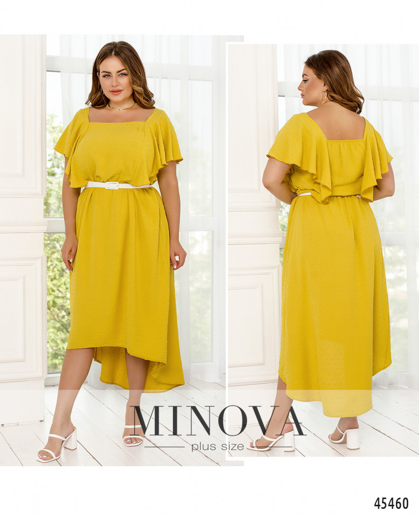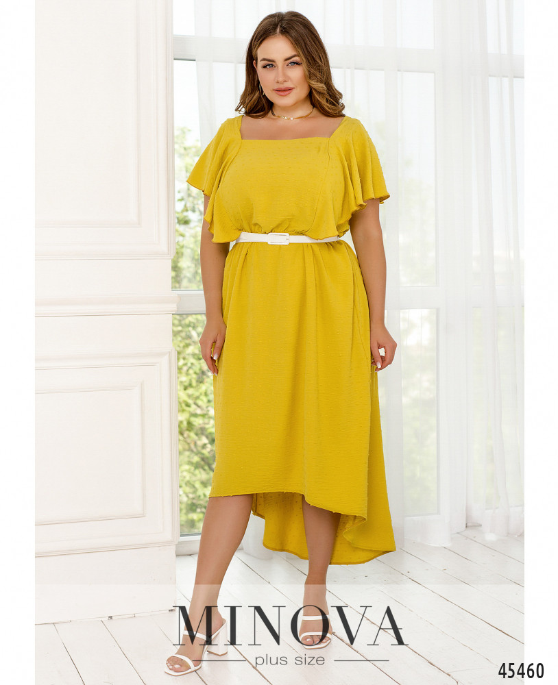 Воздушное платье, выполненное из структурной однотонной ткани, позволит создать оригинальный летний образ в романтическом стиле.  Легкие рукава-крылышки, ниспадающие невесомыми воланами по груди и по спинке, идеально дополнены ассиметричным расклешенным подолом. Особый комфорт платью придают резинки, вшитые по линии талии и на спинке.