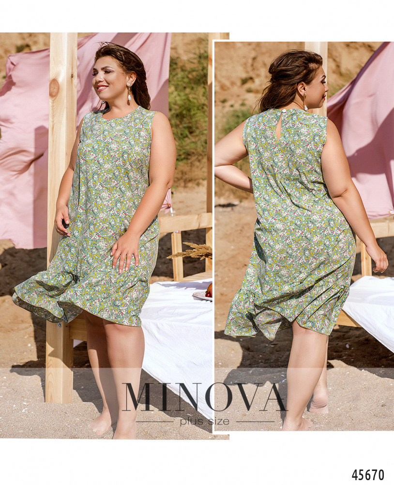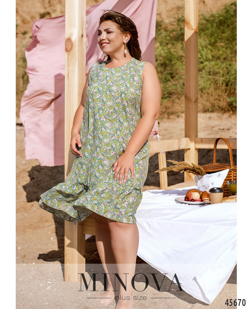 Стильное платье плюс сайз с полукруглым вырезом горловины, застёжка - пуговка сзади под шеей, без рукавов, на груди вытачки, на подоле оборки. Без карманов. Пояс НЕ входит в комплект.