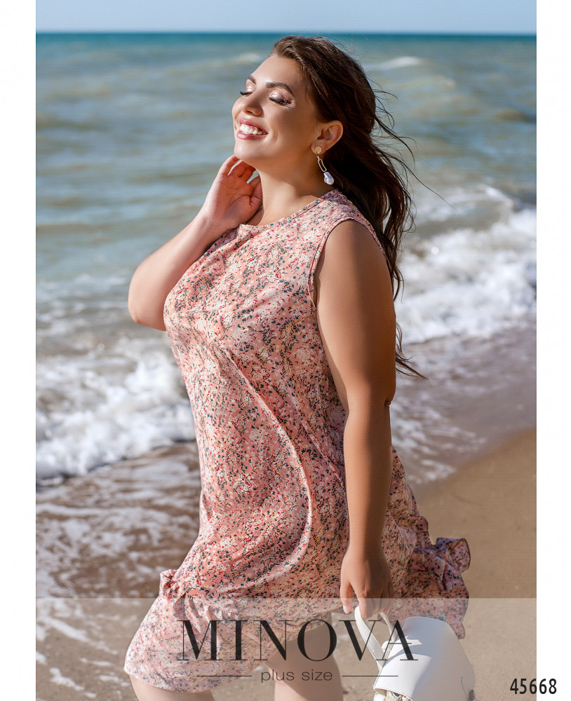 Стильное платье плюс сайз с полукруглым вырезом горловины, застёжка - пуговка сзади под шеей, без рукавов, на груди вытачки, на подоле оборки. Без карманов. Пояс НЕ входит в комплект.