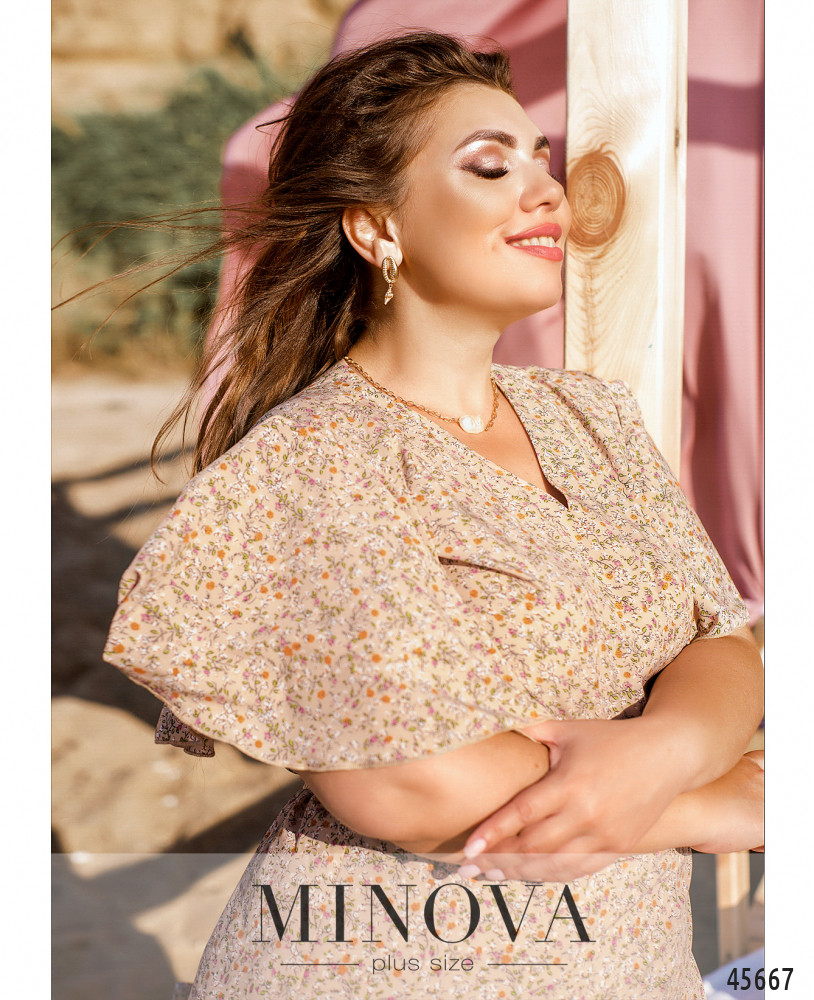 Романтичное платье батал без декора, с рукавами-крылышками. Завязывается на запАх, поясок продевается в прорезь сбоку на талии. Карманов и застёжек нет, подкладки нет. На груди вытачки.