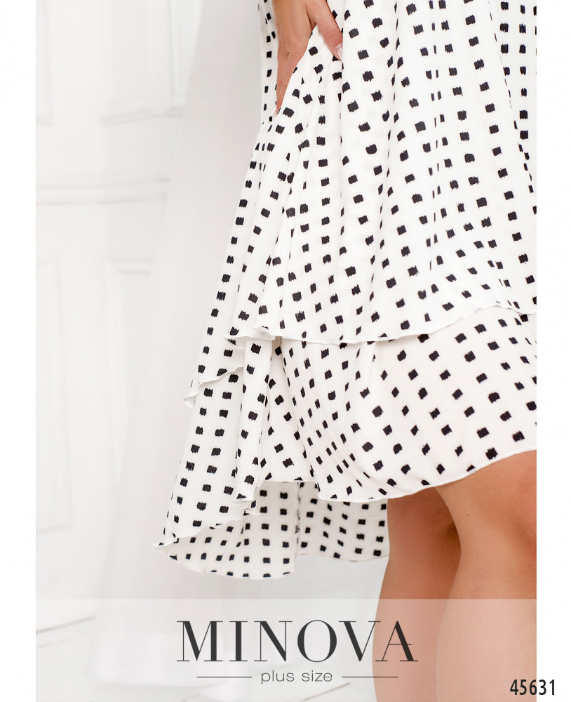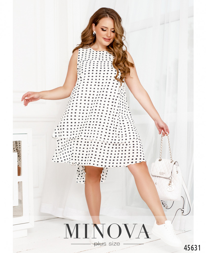 Воздушное летнее платье А-силуэта добавит в ваш образ чуточку кокетства, романтизма и женственности. Изюминкой этой модели является двуслойный ассиметричный подол, удлиненный по спинке и ниспадающий мягкими складками. Платье застегивается сзади на маленькую пуговку под шеей.