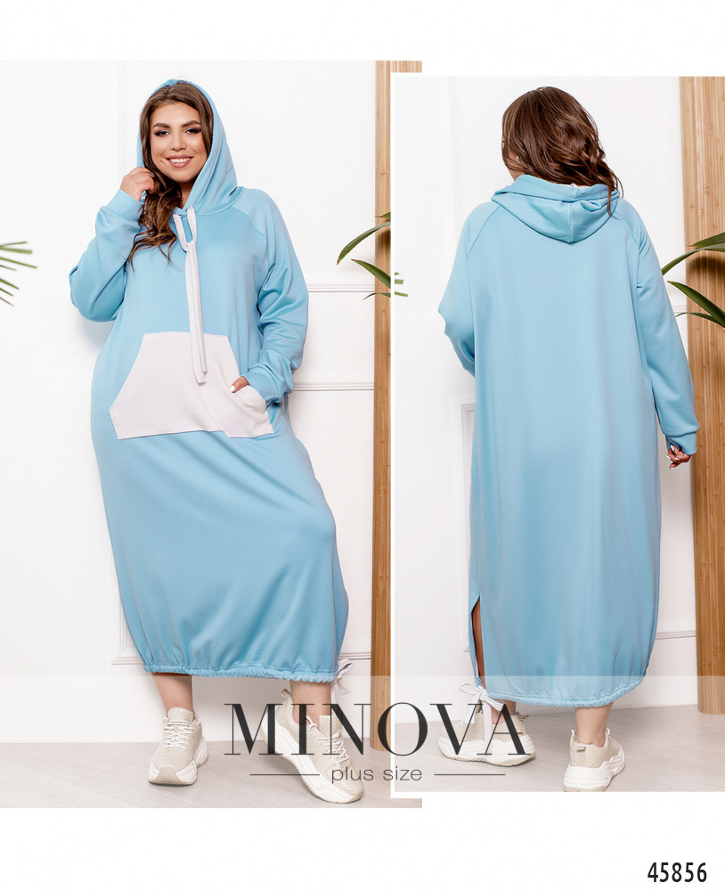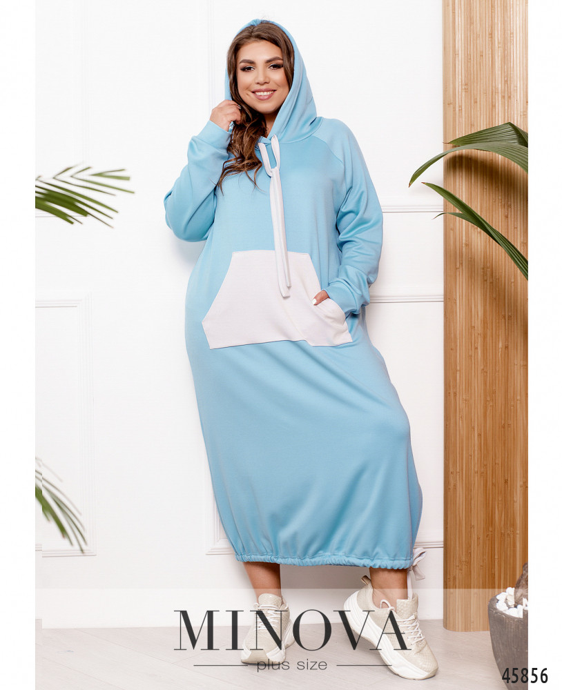 Удобное повседневное платье батал со сквозным карманом на талии, в наличии капюшон со шнурками, рукава с мягкими манжетами, без застёжек.