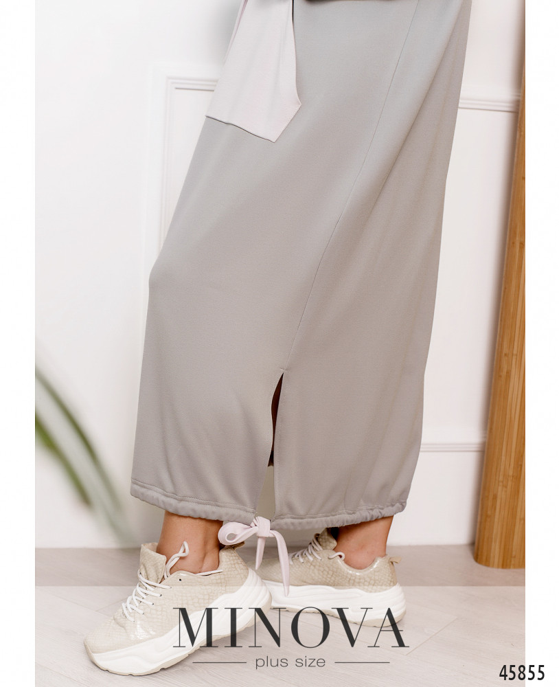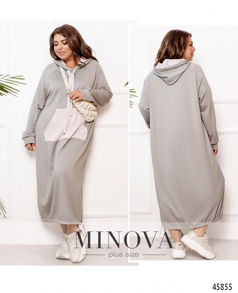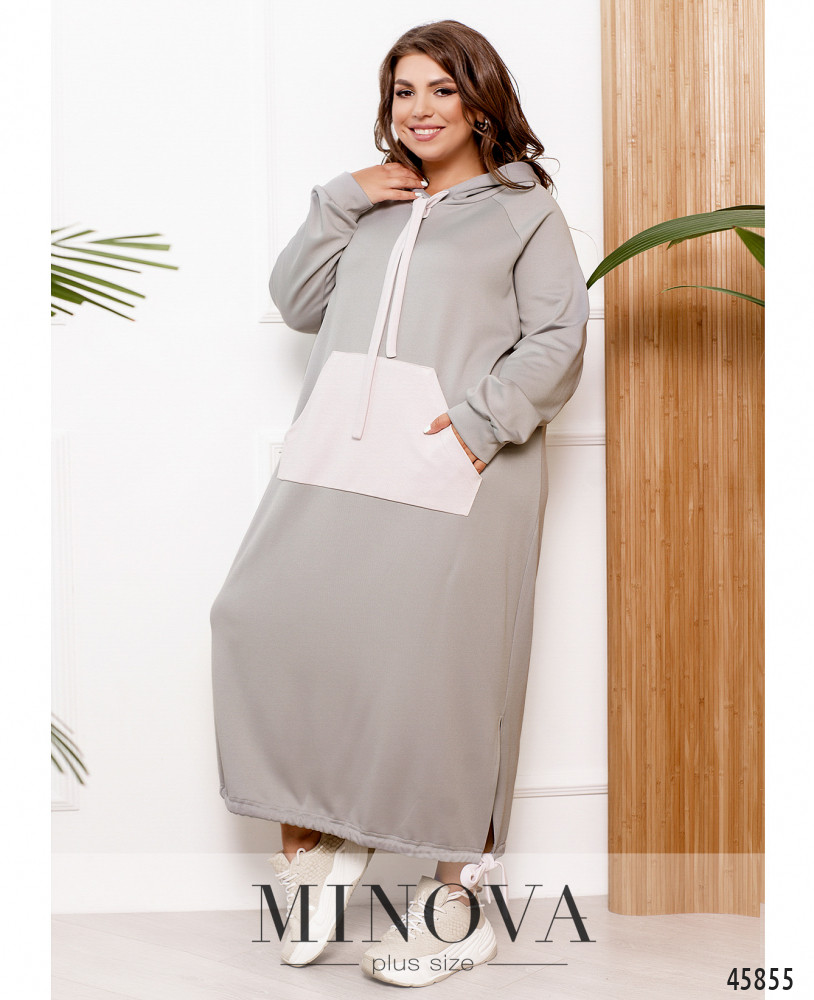 Удобное повседневное платье батал со сквозным карманом на талии, в наличии капюшон со шнурками, рукава с мягкими манжетами, без застёжек.