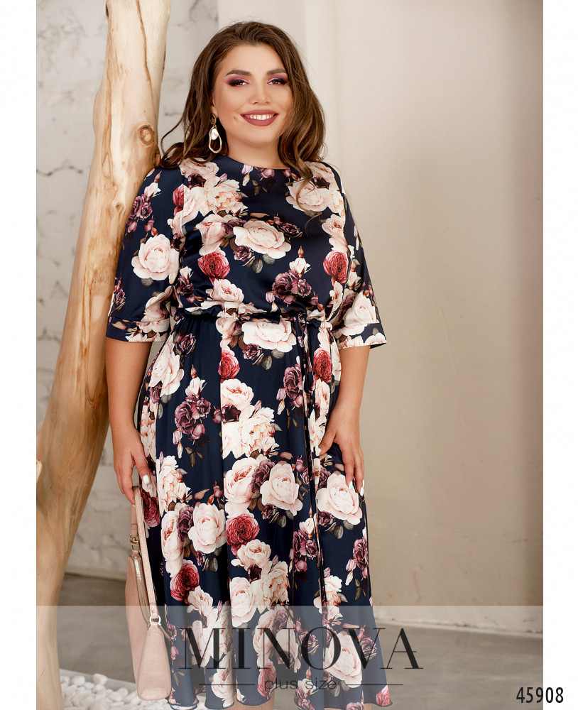 Стильное платье большого размера с коротким рукавом, без застёжек и карманов, с широким полукруглым вырезом горловины. Через талию пропущен шнурок под кулиской, подол ниспадает мягкими оборками.