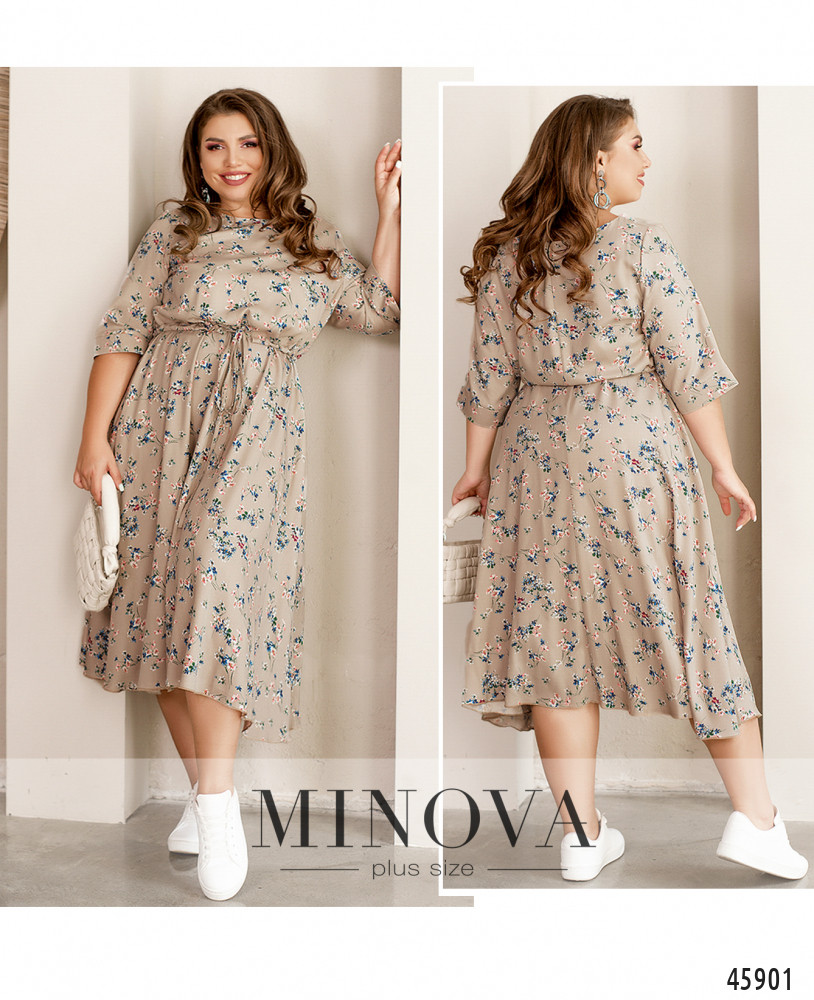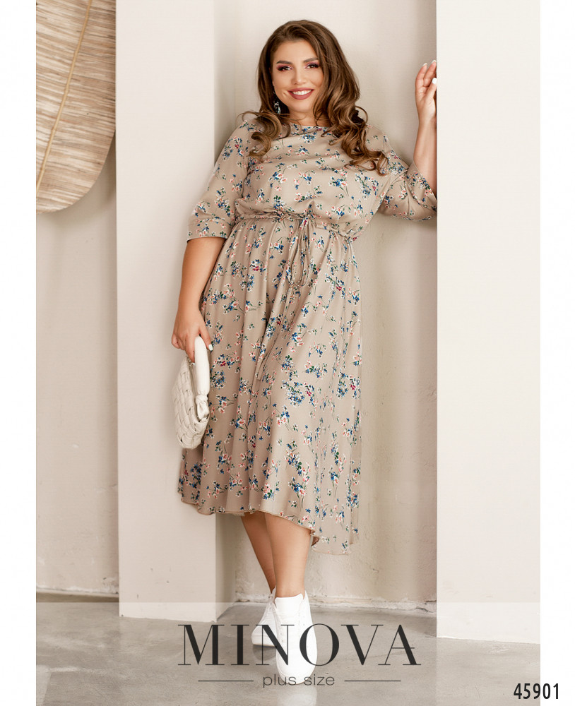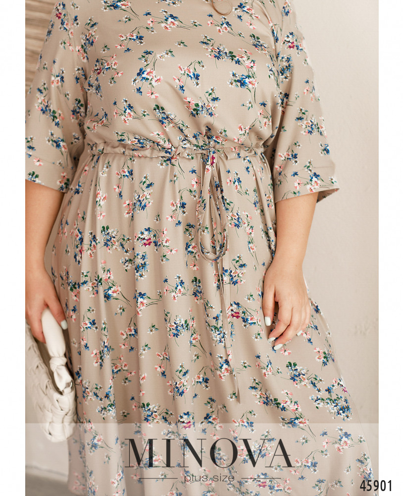 Стильное платье большого размера с коротким рукавом, без застёжек и карманов, с широким полукруглым вырезом горловины. Через талию пропущен шнурок под кулиской, подол ниспадает мягкими оборками.