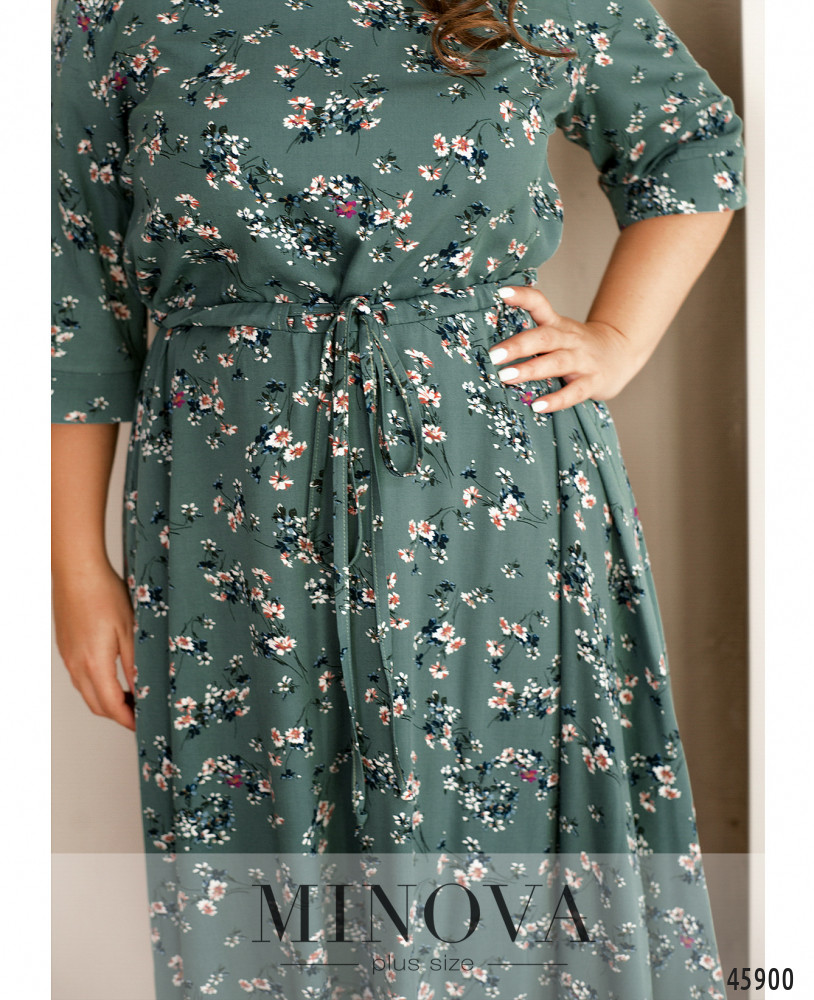 Стильное платье большого размера с коротким рукавом, без застёжек и карманов, с широким полукруглым вырезом горловины. Через талию пропущен шнурок под кулиской, подол ниспадает мягкими оборками.